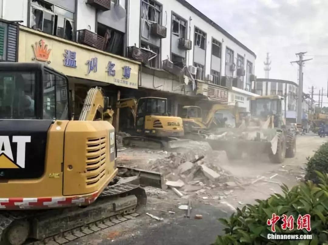 挖機(jī)和鏟車正在清理爆炸現(xiàn)場(chǎng)