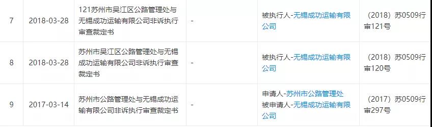 據(jù)公開信息顯示,從2017年至2019年近3年時間內,無錫成功運輸有限公司至少涉及9起法律訴訟。案由涵蓋“機動車交通事故責任糾紛”“違反《公路安全保護條例》第六十四條”等。