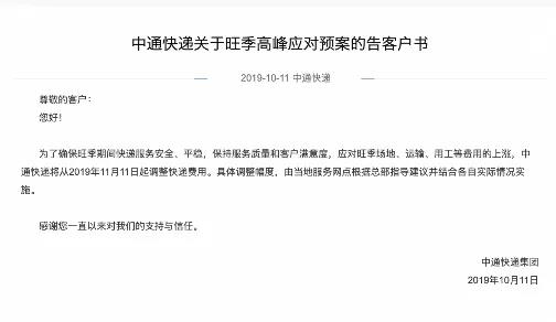 日前,中通快遞發(fā)布關(guān)于旺季高峰應(yīng)對預(yù)案的告客戶書稱為了確保旺季期間快遞服務(wù)安全、平穩(wěn),保持服務(wù)質(zhì)量和客戶滿意度,應(yīng)對旺季場地、運輸 、用工等費用的上漲,中通快遞將從11月11日起調(diào)整費用。
