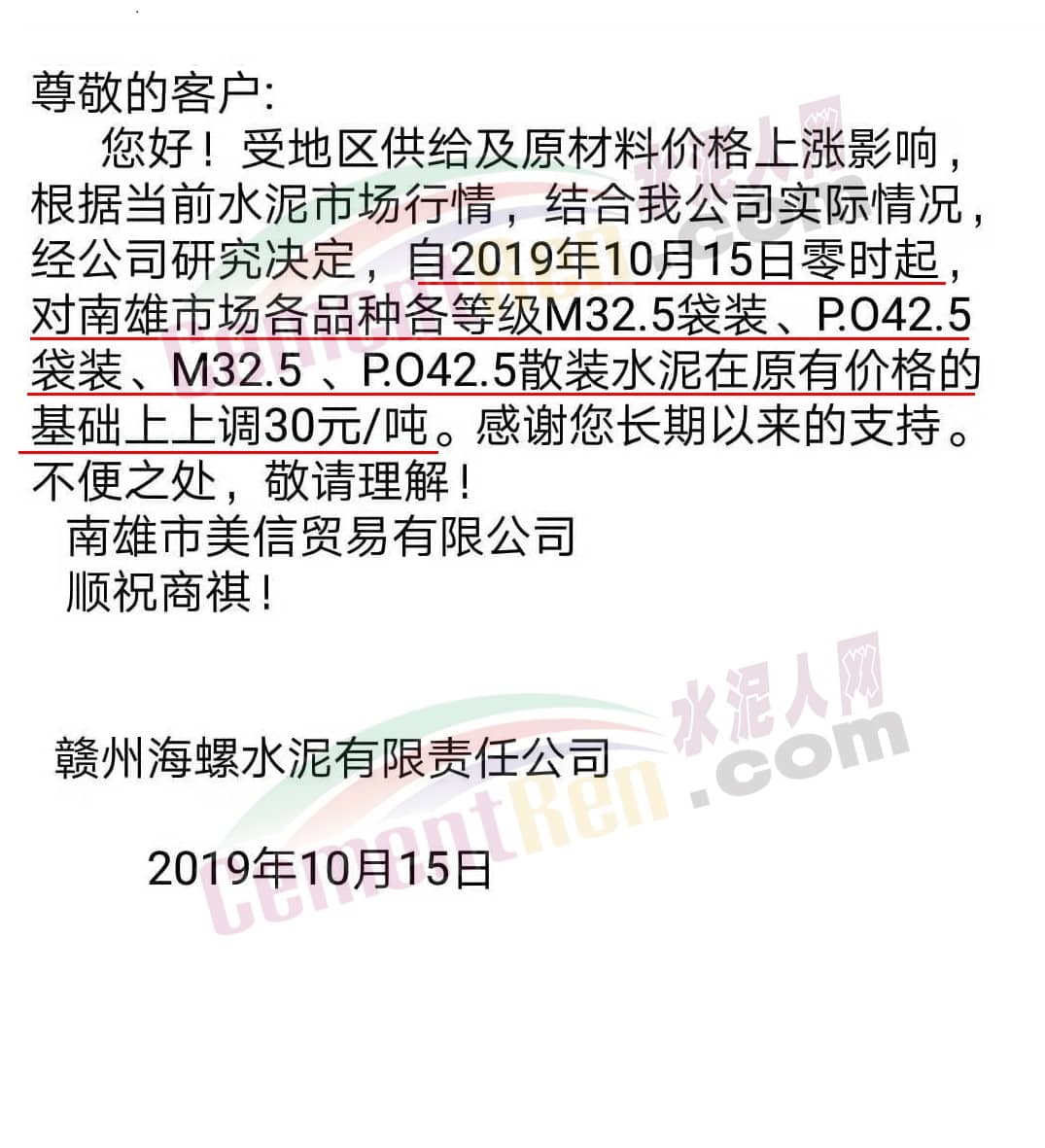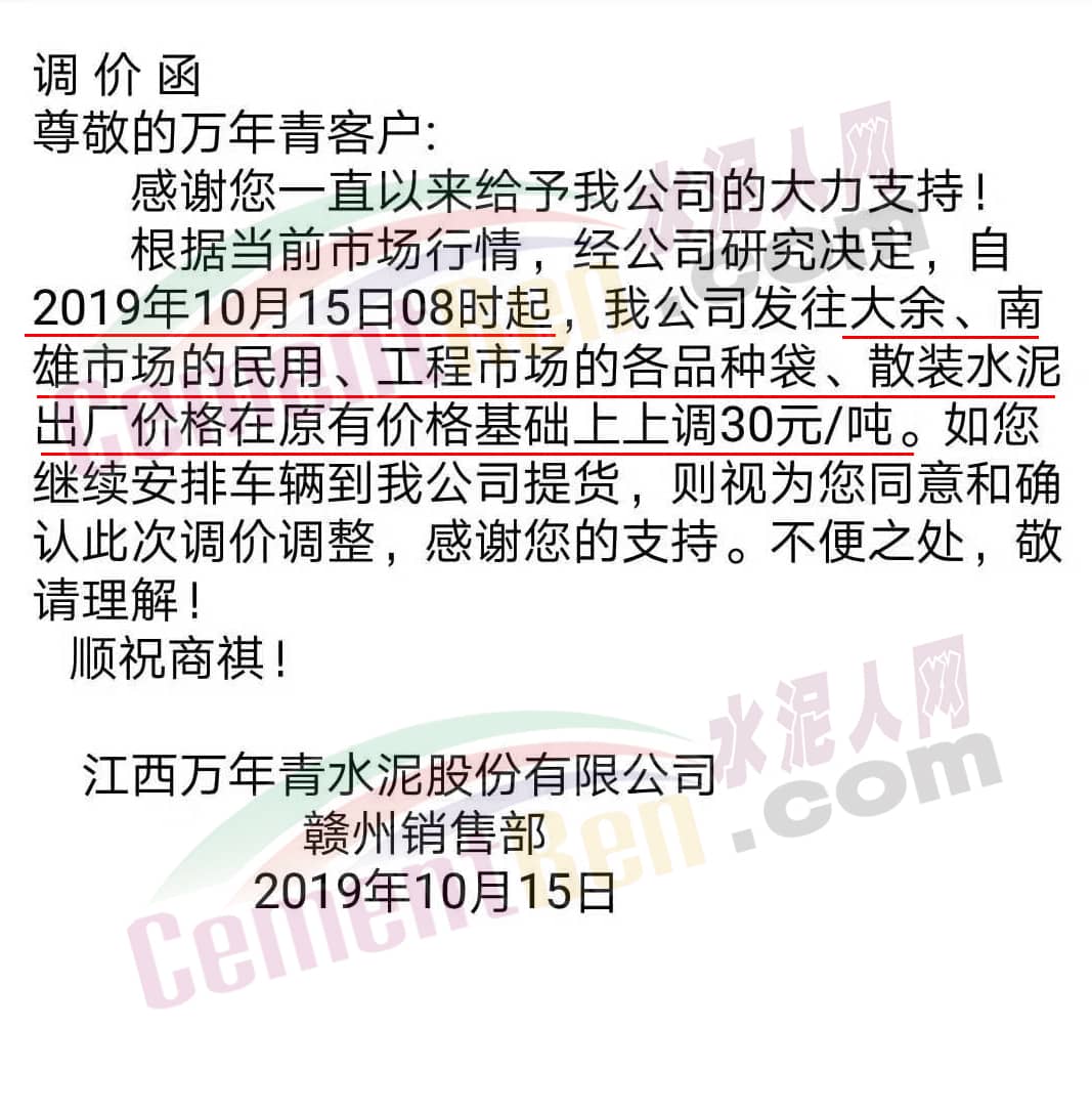 江西萬年青水泥股份有限公司贛州銷售部通知稱自15日8時起,公司發(fā)往大余、南雄市的民用、工程市場的各品種袋、散裝水泥出廠價格在原有價格基礎(chǔ)上上調(diào)30元/噸。