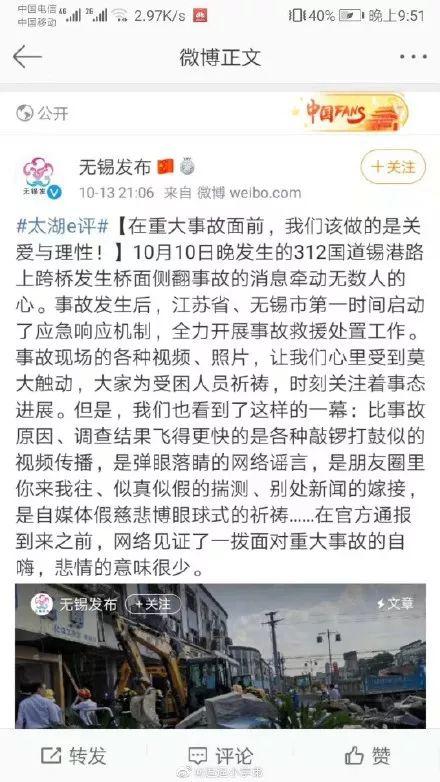 13日晚“無錫發(fā)布”發(fā)布了一篇評論《在重大事故面前,我們該做的是關(guān)愛與理性!》,讓輿情再次發(fā)酵。