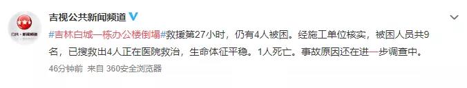 白城市第一時間組織力量科學(xué)施救,在住建、消防專家指導(dǎo)下,經(jīng)過晝夜連續(xù)奮戰(zhàn),截至10月15日下午15時45分左右,9名被困人員全部救出,其中:有4人傷情穩(wěn)定,無生命危險,有5人已死亡,現(xiàn)場搜救工作已完成。