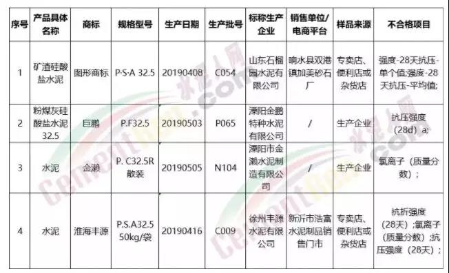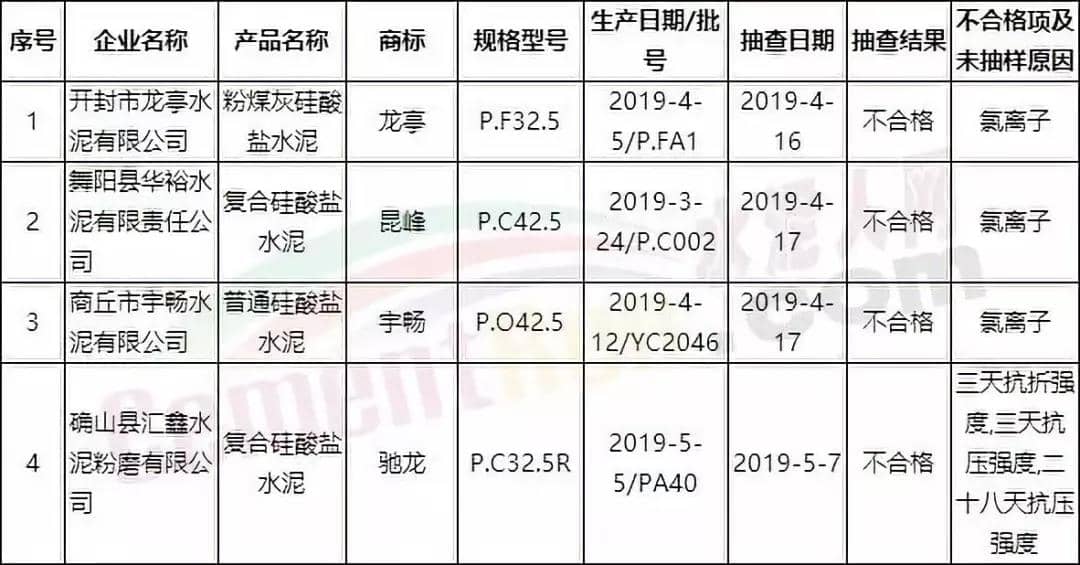 河南省市場監(jiān)督管理局在生產(chǎn)加工環(huán)節(jié)對水泥等19種產(chǎn)品組織開展了監(jiān)督抽查,不合格產(chǎn)品情況中包括四批次水泥: