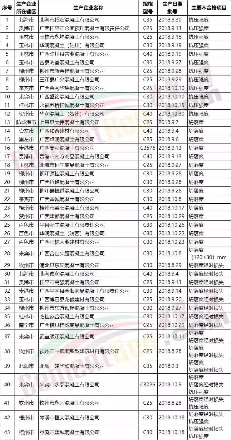 此前,被通報的部分混凝土企業(yè)產(chǎn)品抽檢不合格名單如下: