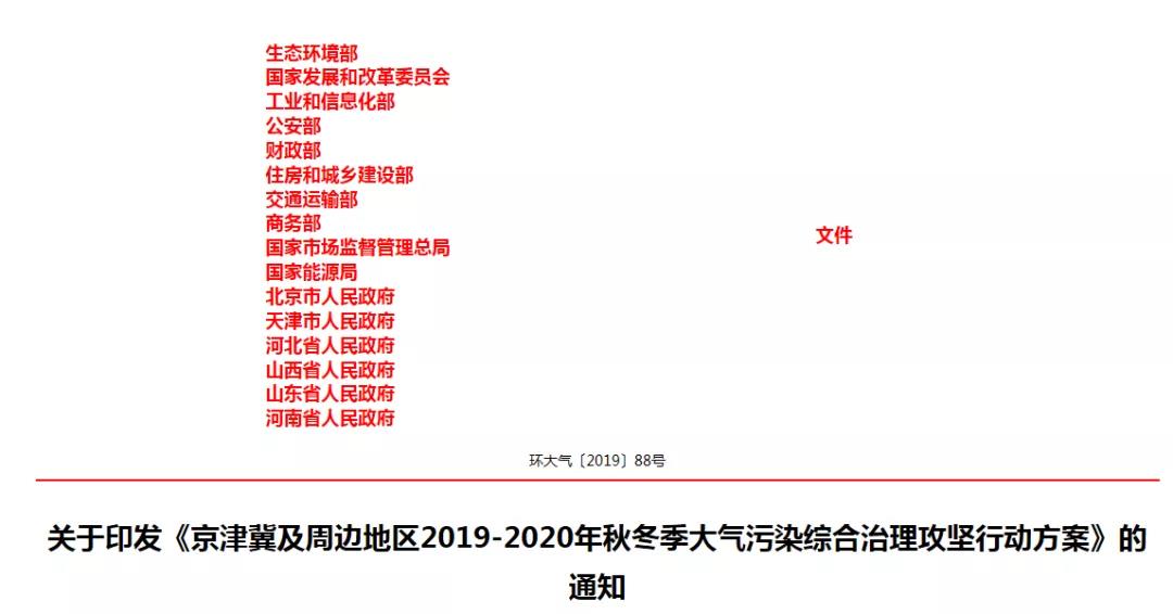 京津冀及周邊地區(qū)2019-2020年秋冬季大氣污染綜合治理攻堅行動方案