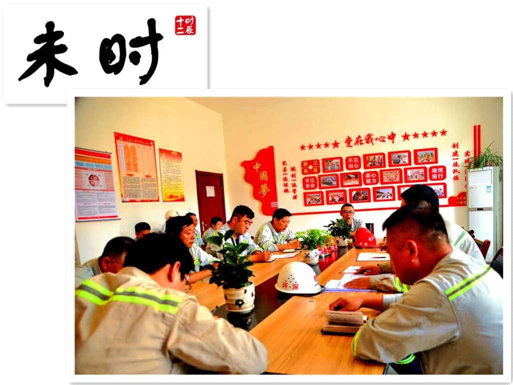 未時(shí)(13:00—15:00)“未時(shí)紅日過街來”。生產(chǎn)設(shè)備部正在召開臨時(shí)會(huì)議,齊心協(xié)力商討2#水泥磨的檢修計(jì)劃,及圍繞此計(jì)劃實(shí)施的安全生產(chǎn)細(xì)則。