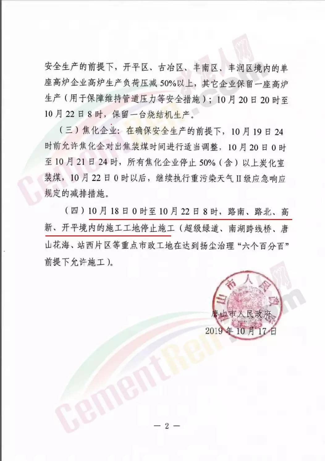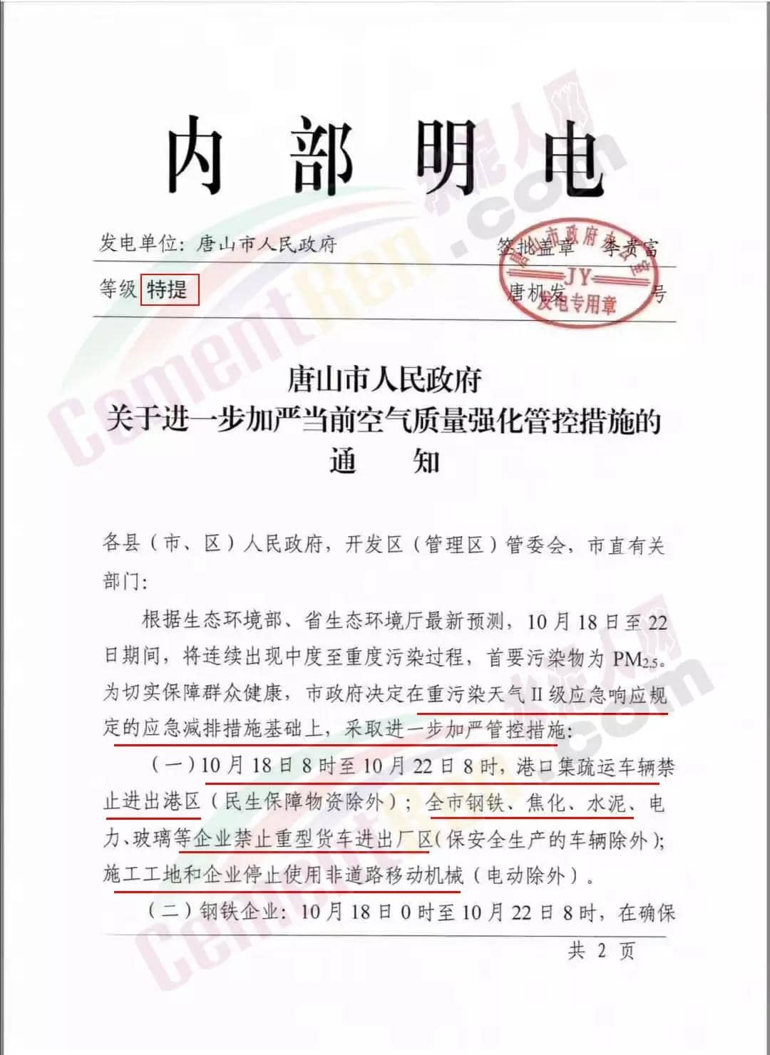 河北唐山三天發(fā)兩份特提文件,要求水泥停產(chǎn),禁運,工地停工