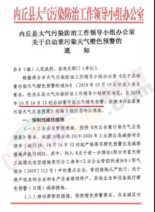 日前,河南省污染防治攻堅戰(zhàn)領導小組辦公室剛下發(fā)《關于啟動重污染天氣橙色預警的通知》要求 鄭州、開封、洛陽、平頂山、安陽、鶴壁、新鄉(xiāng)、焦作、濮陽、許昌、商丘、濟源 12 市于 10 月 18 日 0 時啟動重污染天氣橙色預警及Ⅱ級響應,提前應急應對,確保各項管控措施落實到位。