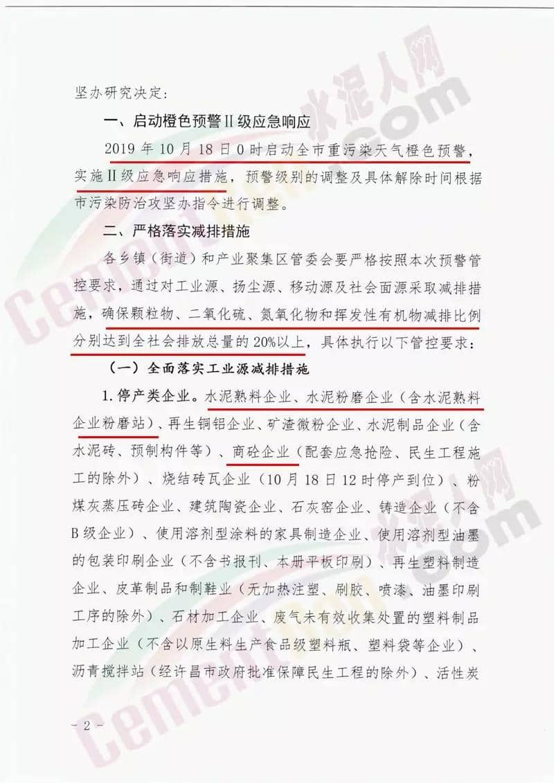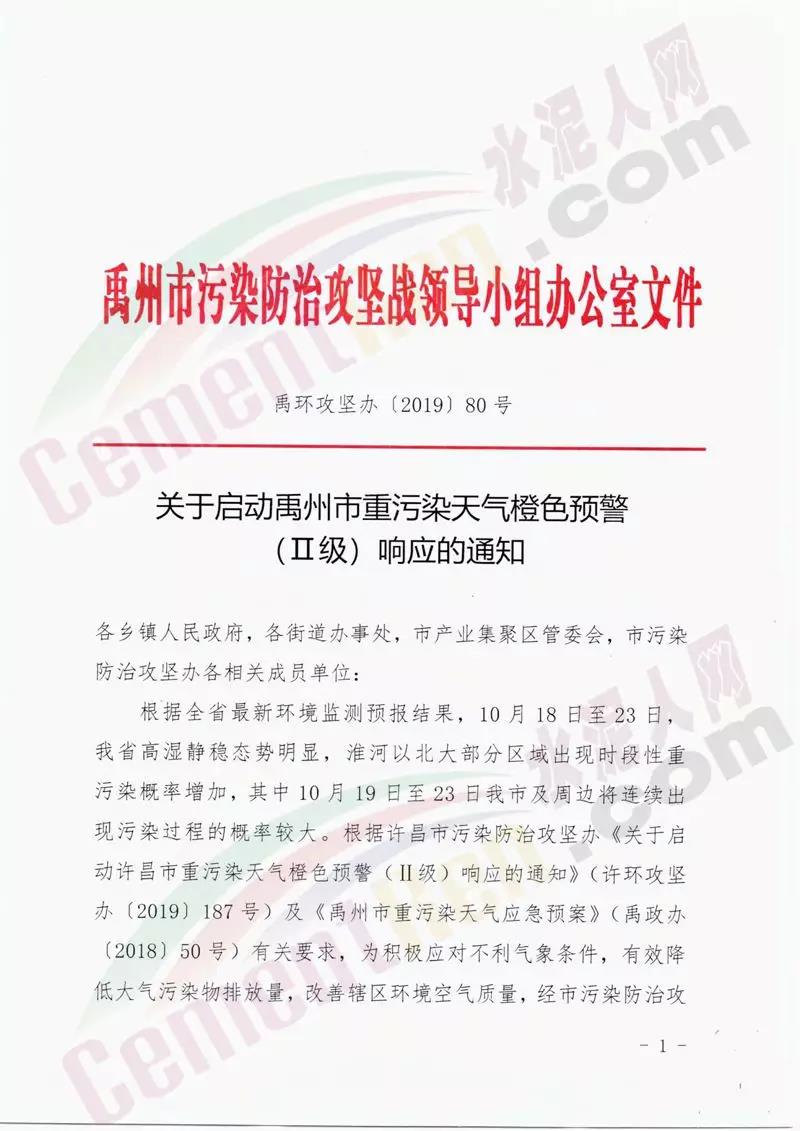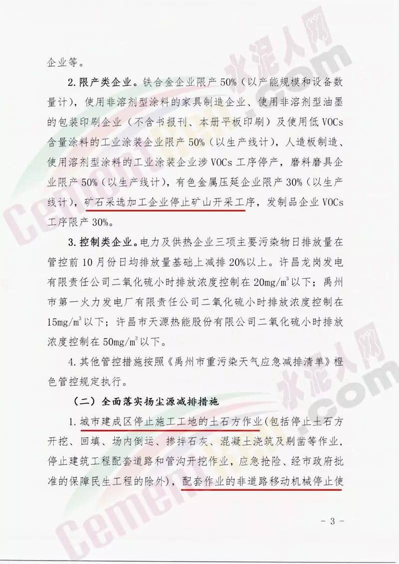 河南禹州自10月18日0時起啟動全市重污染天氣橙色預警,實施II級應急呼應措施。要求確保顆粒物、二氧化硫、氮氧化物和揮發(fā)性有機物減排比例分別達到全社會的20%以上。要求工業(yè)企業(yè)全面落實工業(yè)源減排措施,其中水泥熟料企業(yè)、水泥粉磨站企業(yè)(含水泥熟料企業(yè)粉磨站)、商砼企業(yè)等停產(chǎn);礦石采選加工企業(yè)停產(chǎn)礦山開采工序。城市建成區(qū)停止施工工地的土石方作業(yè),配套作業(yè)的非道路移動機械停止使用。詳情如下:
