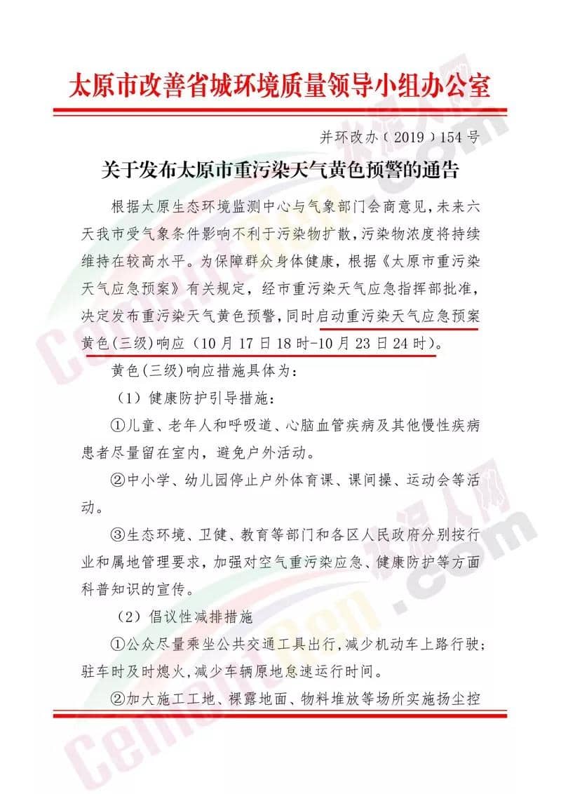 太原市改善省城環(huán)境質(zhì)量領導小組辦公室發(fā)布《關于發(fā)布太原市重污染天氣黃色預警的通告》稱,自10月17日18時至10月23日24時啟動重污染天氣應急預案黃色(三級)響應。