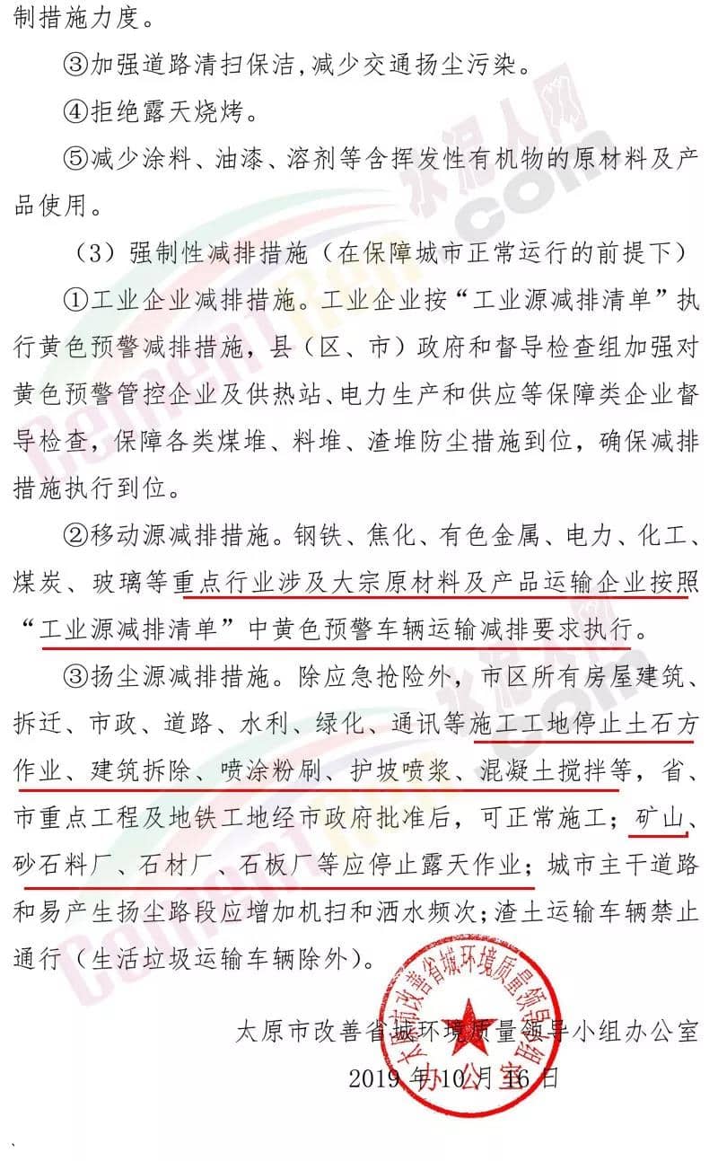 要求重點行業(yè)涉及大宗原材料及產(chǎn)品運輸企業(yè)按照“工業(yè)減排清單”中黃色預警車輛運輸減排要求執(zhí)行。同時要求施工工地停止土石方作業(yè)、建筑拆除、混凝土攪拌等;礦山、砂石料 廠、石材廠、石板廠等停止露天作業(yè)等。