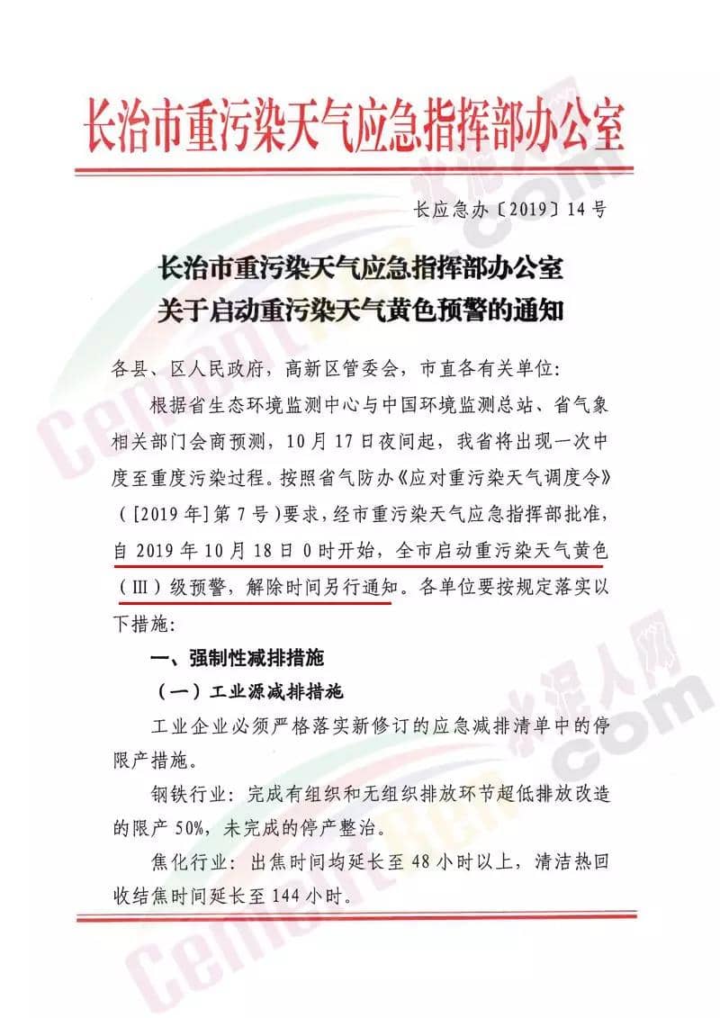 山西長治市重污染天氣應急指揮部辦公室發(fā)布《關于啟動重污染天氣黃色預警的通知》稱將自今日(18)0時開始,全市啟動重污染天氣黃色(III)級預警,解除時間另行通知。預警管控期間,水泥、建材、采石采砂等行業(yè)全部停產(chǎn)。詳情如下: