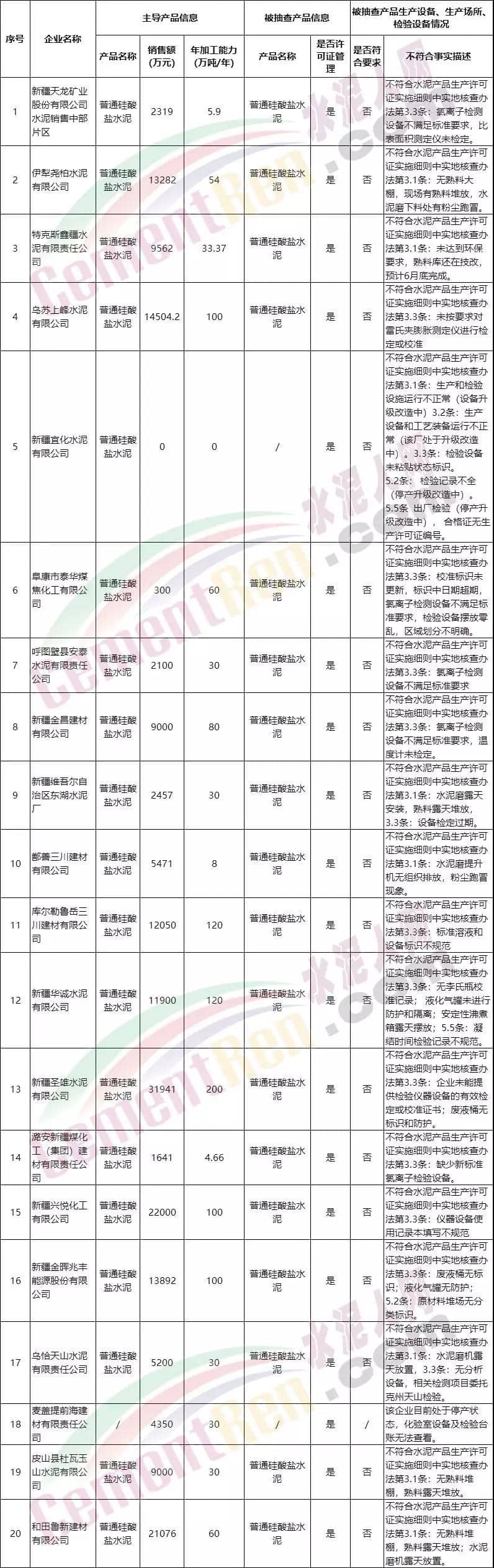 同期對各企業(yè)生產(chǎn)條件進(jìn)行了監(jiān)督檢查。各地市場監(jiān)督管理部門與新疆維吾爾自治區(qū)產(chǎn)品質(zhì)量監(jiān)督檢驗(yàn)研究院共同對涉及工業(yè)產(chǎn)品生產(chǎn)許可證的水泥等生產(chǎn)企業(yè)開展生產(chǎn)條件現(xiàn)場監(jiān)督檢查。檢查結(jié)果顯示,大部分企業(yè)證照及資質(zhì)齊全,生產(chǎn)條件規(guī)范,建立了質(zhì)量安全相關(guān)制度。但仍有部分企業(yè)履行質(zhì)量安全主體責(zé)任淡薄,質(zhì)量管理體系有待健全和完善。問題主要體現(xiàn)在以下幾個方面:一是部分檢驗(yàn)設(shè)備沒有檢定和校準(zhǔn),或超出檢定校準(zhǔn)周期,現(xiàn)場無法提供有效的檢定或校準(zhǔn)證書,部分設(shè)備沒有進(jìn)行有效的維護(hù)保養(yǎng),檢驗(yàn)準(zhǔn)確性存在安全隱患;二是部分企業(yè)過程控制不嚴(yán)、出廠檢驗(yàn)記錄不全,原輔料驗(yàn)收記錄、出廠檢驗(yàn)記錄等不完整,原輔料存放條件不規(guī)范,產(chǎn)品質(zhì)量安全存在風(fēng)險;三是部分企業(yè)風(fēng)險分析制度不完備,缺少產(chǎn)品追溯和召回管理記錄,內(nèi)部管理有待加強(qiáng)。2019年新疆自治區(qū)水泥生產(chǎn)企業(yè)生產(chǎn)條件檢查結(jié)果不符合匯總表