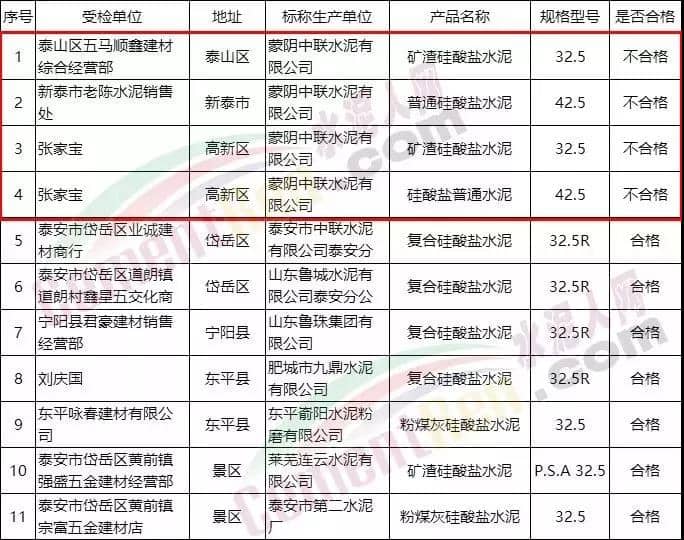 山東泰安4批次樣品不合格,抽樣合格率為63.6%據(jù)通報,泰安市市場監(jiān)管局于2019年8月至10月在全市范圍內(nèi)組織開展了第一批流通領(lǐng)域水泥商品質(zhì)量監(jiān)督抽查。本次共監(jiān)督抽查10家經(jīng)營部,抽取11批次樣品。其中檢出4批次樣品不合格,本次水泥商品抽樣合格率為63.6%。4個批次不合格水泥基本情況:2批次礦渣硅酸鹽水泥和2批次普通硅酸鹽水泥;標(biāo)稱生產(chǎn)單位均為蒙陰中聯(lián)水泥有限公司;標(biāo)識生產(chǎn)單位地址均為山東省蒙陰縣蒙陰鎮(zhèn)東城村;包裝袋上標(biāo)注商標(biāo)均為蒙陰中聯(lián);不合格樣品的不合格項(xiàng)目主要有氯離子、燒失量、3天強(qiáng)度、28天強(qiáng)度等。經(jīng)營者分別是泰山區(qū)五馬順鑫建材綜合經(jīng)營部,新泰市老陳水泥銷售處,北集坡鎮(zhèn)張家寶。泰安市2019年度流通領(lǐng)域水泥商品質(zhì)量第一批專項(xiàng)監(jiān)督抽查結(jié)果總匯表