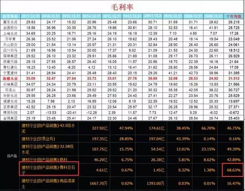 這里匯總了18家上市公司近十年的毛利率情況。毫無懸念,海螺水泥毛利率十年均值是同行業(yè)最高的。從產(chǎn)品的角度來看,我們很難看出到底是哪一類產(chǎn)品決定著毛利率,因為海螺水泥的產(chǎn)品中前三種幾乎差不了多少。