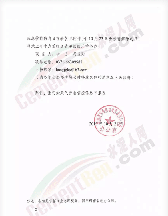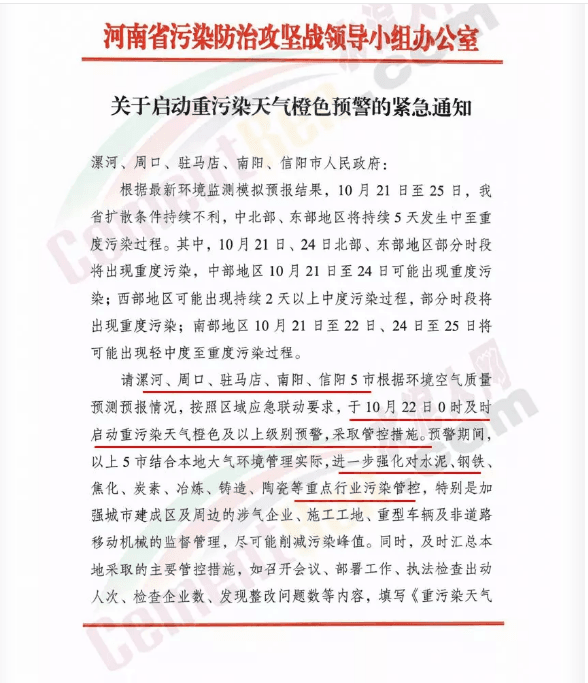 水泥人網(wǎng)消息,日前河南省污染防治攻堅戰(zhàn)領(lǐng)導(dǎo)小組辦公室發(fā)布的《關(guān)于啟動重污染天氣橙色預(yù)警的緊急通知》要求漯河、周口、駐馬店、南陽,信陽5個地區(qū)根據(jù)環(huán)境空氣質(zhì)量預(yù)測預(yù)報情況,按照區(qū)域應(yīng)急聯(lián)動要求,于10月22日0時及時啟動重污染天氣橙色及以上級別預(yù)警,采取管控措施。