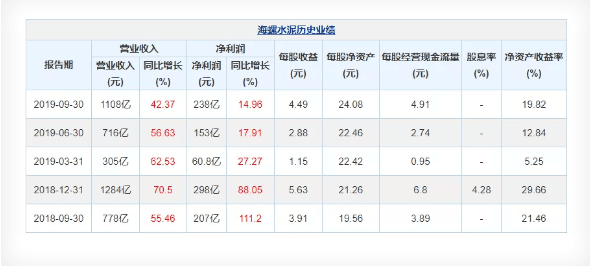 水泥人網(wǎng)消息:海螺水泥10月23日最新公布的2019年三季報(bào)顯示,前三季度營業(yè)收入1108億元,同比增長42.37%;歸屬于上市公司股東的凈利潤238億元,同比增長14.96%?;久抗墒找?.49元。