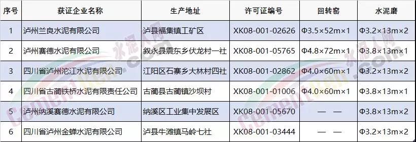 據(jù)查詢,市場監(jiān)管總局工業(yè)品生產(chǎn)許可證辦公室數(shù)據(jù)顯示四川省瀘州市6家已取得工業(yè)品生產(chǎn)許可證的水泥企業(yè)中瀘州蘭良水泥有限公司、瀘州賽德水泥有限公司、四川省瀘州沱江水泥有限公司、四川省古藺鐵橋水泥有限責任公司4家企業(yè)關(guān)鍵設(shè)備中包括熟料生產(chǎn)工序關(guān)鍵設(shè)備回轉(zhuǎn)窯及水泥生產(chǎn)工序關(guān)鍵設(shè)備水泥磨;而瀘州納溪賽德水泥有限公司和四川省瀘州金蟬水泥有限公司關(guān)鍵設(shè)備僅包括水泥磨。