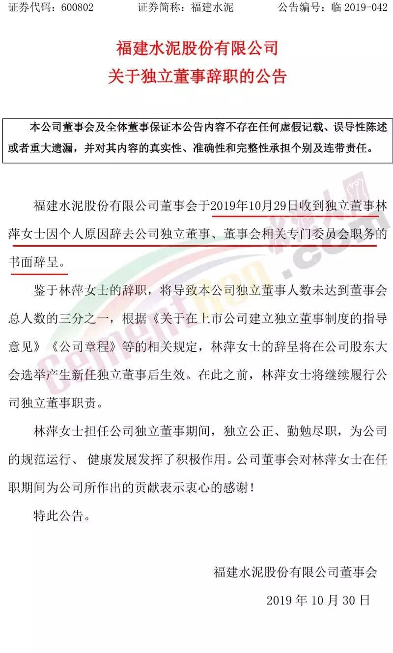 福建水泥:10月29日,福建水泥股份有限公司(600802)董事會于2019年10月29日收到獨立董事林萍因個人原因辭去公司獨立董事、董事會相關專門委員會職務的書面辭呈。林萍自2016年8月12日任獨立董事,最新一期披露的年薪為4萬元。其任職期間公司股價下跌11.2%,當日股價下跌4.04%。林萍任職期間,福建水泥市值從31.65億元跌至28.14億元,市值縮水了3.51億元。最新財報顯示,福建水泥股份有限公司2019年第三季度營業(yè)總收入為19.75億,同比下滑1.04%;歸屬凈利潤為2.58億,同比下滑19.91%。福建水泥股份有限公司始創(chuàng)于1958年,具有五十多年的歷史,為福建省傳統(tǒng)企業(yè),公司主要從事水泥及熟料的生產(chǎn)及銷售,是福建地區(qū)產(chǎn)能規(guī)模具大的水泥制造企業(yè),生產(chǎn)的產(chǎn)品主要有“建福”和“煉石”兩個品牌的各等級硅酸鹽水泥,通過公路、鐵路運輸渠道,將產(chǎn)品送往福建省各區(qū)域市場。根據(jù)上市企業(yè)數(shù)據(jù)庫信息顯示:林萍,教授。畢業(yè)于華東理工大學硅酸鹽工程專業(yè),本科學歷,獲廈門大學工商管理碩士學位和企業(yè)管理博士學位?,F(xiàn)任閩江學院教授,碩士生導師,兼任全球中小企業(yè)創(chuàng)業(yè)聯(lián)合會副秘書長,科技部國家專家?guī)鞂<?。曾任閩江學院副教授,美國哥倫比亞大學訪問學者。擅長企業(yè)管理的咨詢,主持十幾項省廳級課題,在核心刊物發(fā)表論文二十幾篇。公告原文如下: