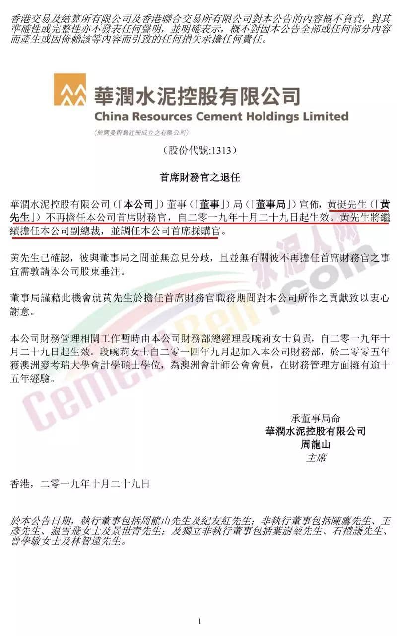 華潤水泥控股華潤水泥控股(01313)發(fā)布公告,黃挺不再擔任公司首席財務官,自2019年10月29日起生效。黃挺將繼續(xù)擔任公司副總裁,并調(diào)任公司首席采購官。公司財務管理相關工作暫時由公司財務部總經(jīng)理段畹莉負責,自2019年10月29日起生效。段畹莉自2014年9月起加入公司財務部,于2005年獲澳洲麥考瑞大學會計學碩士學位,為澳洲會計師公會會員,在財務管理方面擁有逾15年經(jīng)驗。公告原文如下: