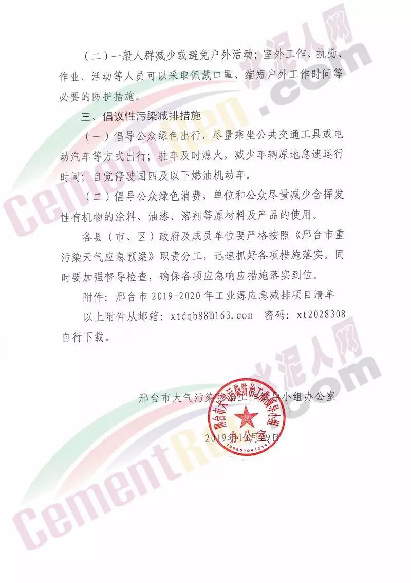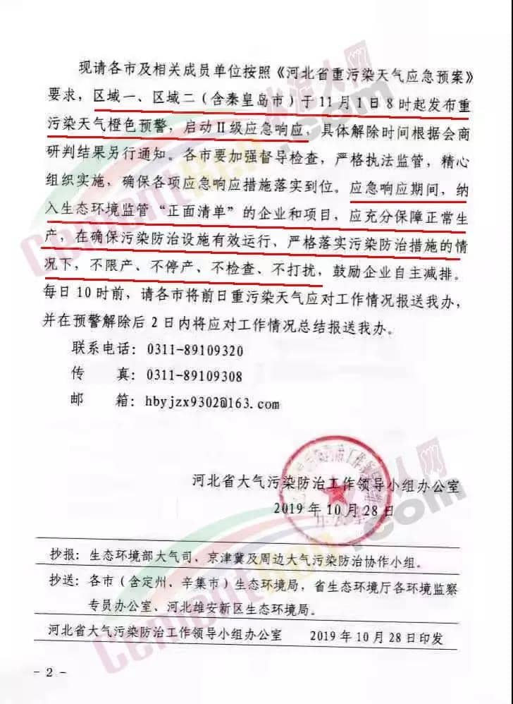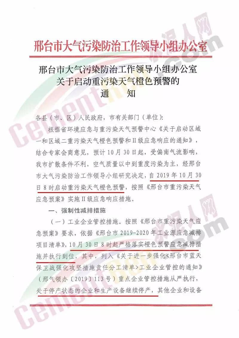 河北邢臺(tái)市大氣污染防治工作領(lǐng)導(dǎo)小組辦公室發(fā)布《關(guān)于啟動(dòng)重污染天氣橙色預(yù)警的通知》要求,自10月30日8時(shí)起啟動(dòng)重污染天氣橙色預(yù)警,按照《邢臺(tái)市重污染天氣應(yīng)急預(yù)案》實(shí)施II級(jí)應(yīng)急響應(yīng)措施。并要求10月30日8時(shí)起嚴(yán)格落實(shí)橙色預(yù)警應(yīng)急減排措施并執(zhí)行到位,列入《關(guān)于進(jìn)一步強(qiáng)化<邢臺(tái)市藍(lán)天保衛(wèi)戰(zhàn)強(qiáng)化攻堅(jiān)措施責(zé)任分工清單>工業(yè)企業(yè)管控的通知》文件的重點(diǎn)企業(yè)管理措施從嚴(yán)執(zhí)行,處于停產(chǎn)狀態(tài)的企業(yè)和生產(chǎn)設(shè)備繼續(xù)停產(chǎn)。通知原文如下: