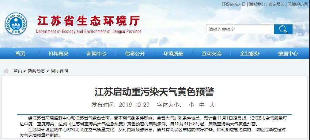 江蘇省生態(tài)環(huán)境廳消息:經(jīng)會(huì)商,受不利氣象條件影響,江蘇全省大氣擴(kuò)散條件較差,預(yù)計(jì)自11月1日凌晨起,沿江8市空氣質(zhì)量可達(dá)中度—重度污染,達(dá)到《江蘇省重污染天氣應(yīng)急預(yù)案》黃色預(yù)警的啟動(dòng)條件。建議自10月31日8時(shí)起,啟動(dòng)重污染天氣黃色預(yù)警。