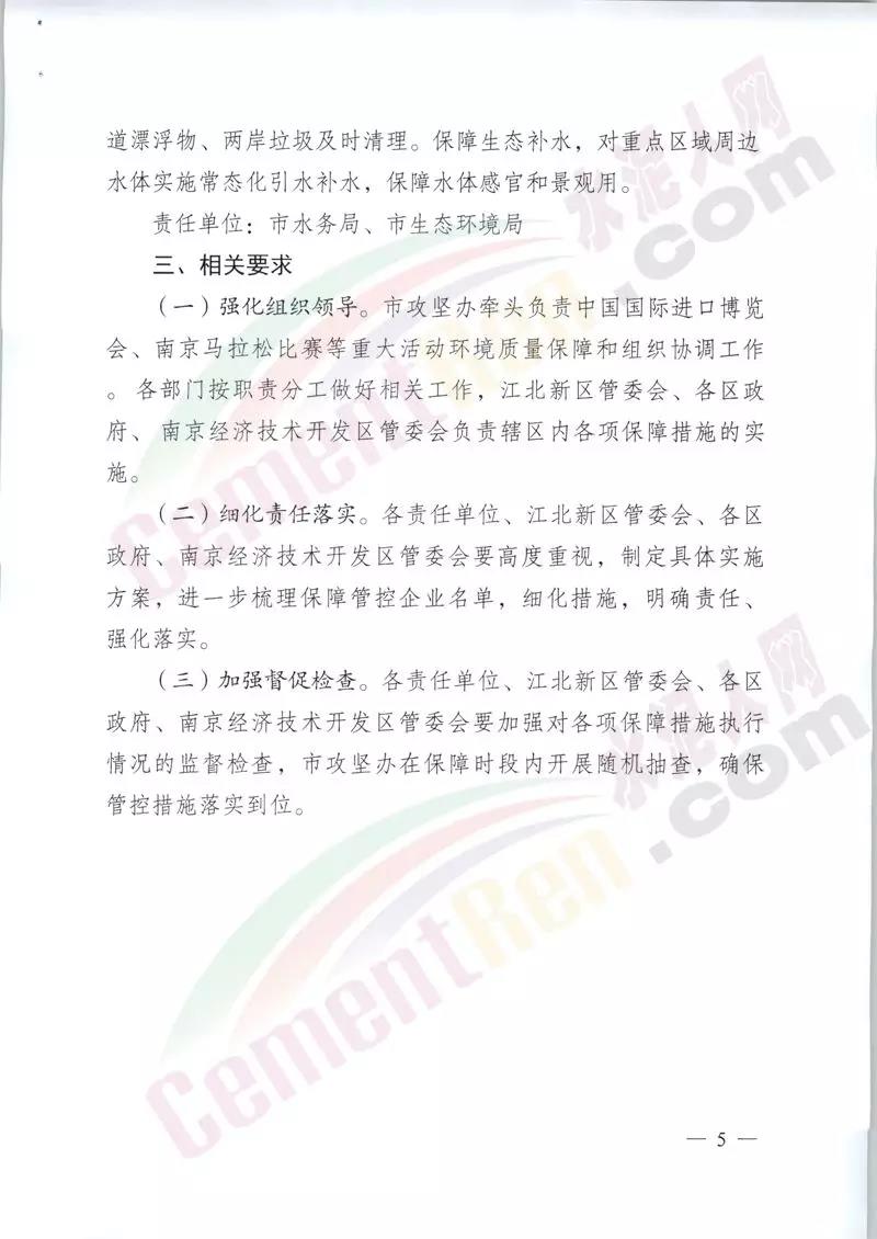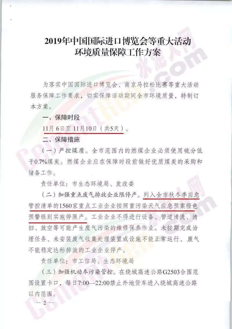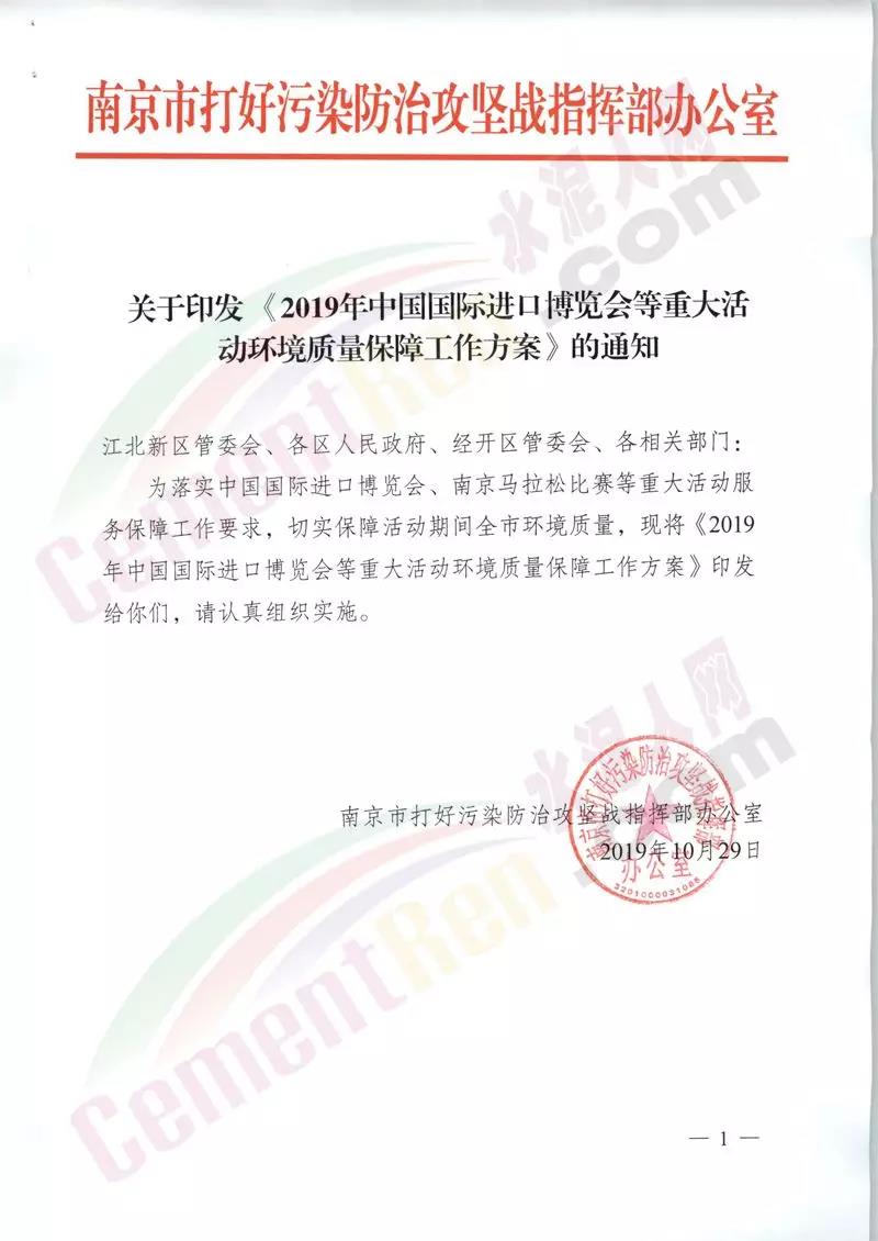 南京市打好污染防治攻堅戰(zhàn)指揮部辦公室發(fā)布《2019年中國國際進口博覽會等重大活動環(huán)境質(zhì)量保障工作方案》。保障時段為11月6日至11月10日(共5天)。保障措施包括嚴控煤質(zhì)及加強重點廢氣排放企業(yè)限停產(chǎn),要求列入全市秋冬應(yīng)急管控清單的1560家重點工業(yè)企業(yè)按照重污染天氣應(yīng)急預(yù)案橙色預(yù)警級別實施停限產(chǎn)。全市主城范圍內(nèi)工業(yè)企業(yè)的柴油貨車停止運輸和裝卸作業(yè),暫停沙石等易揚塵污染的物料運輸 ,暫停自卸車傾倒作業(yè)。長江南京靠泊船舶采取使喚用岸電或改燃低硫油等低排放控制措施。暫停長江南京段碼頭和船舶產(chǎn)生大氣污染的裝卸作業(yè),減少大氣污染排放。強化非道路移動機械管控。實施工地停工,停止所有土方、樁基等易揚塵作業(yè),停止渣土運輸 。通知原文如下: