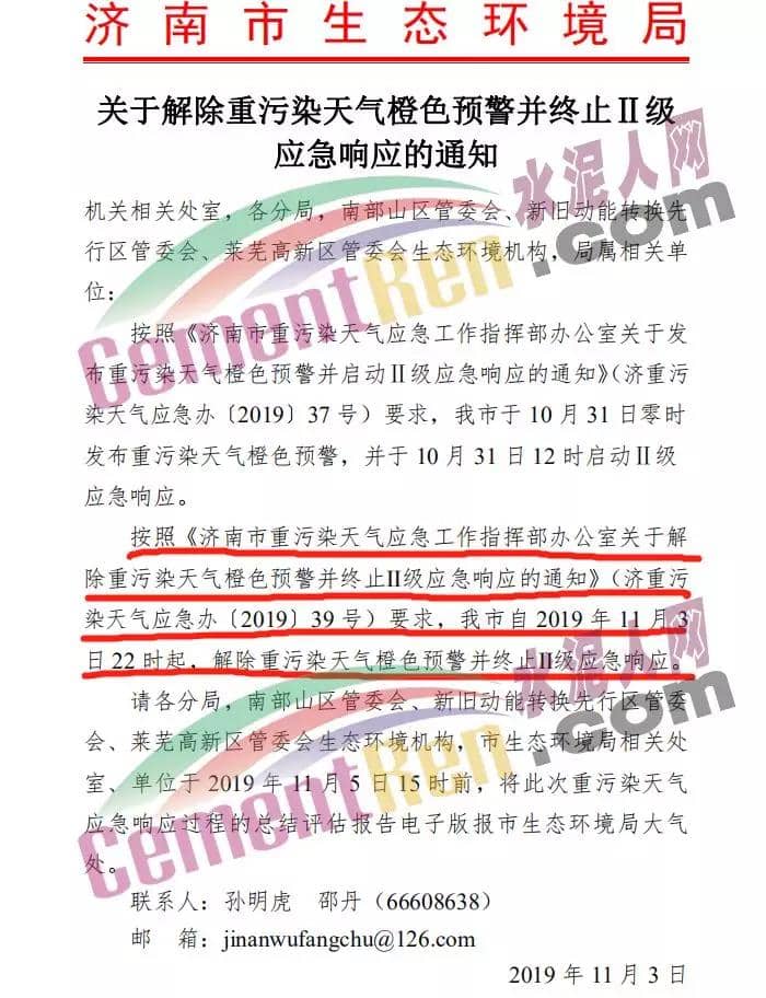 據(jù)水泥人網(wǎng)了解,昨日(11月3日)濟南市生態(tài)環(huán)境局發(fā)布《關(guān)于解除重污染天氣橙色預(yù)警并終止II級應(yīng)急響應(yīng)的通知》稱,按照《濟南市重污染天氣應(yīng)急工作指揮部辦公室關(guān)于解除重污染天氣橙色預(yù)警并終止II級應(yīng)急響應(yīng)的通知》(濟重污染天氣應(yīng)急(2019)39號),濟南市2019年11月3日22時起,解除重污染天氣橙色預(yù)警并終止II級應(yīng)急響應(yīng)。