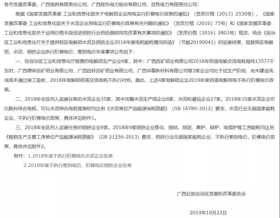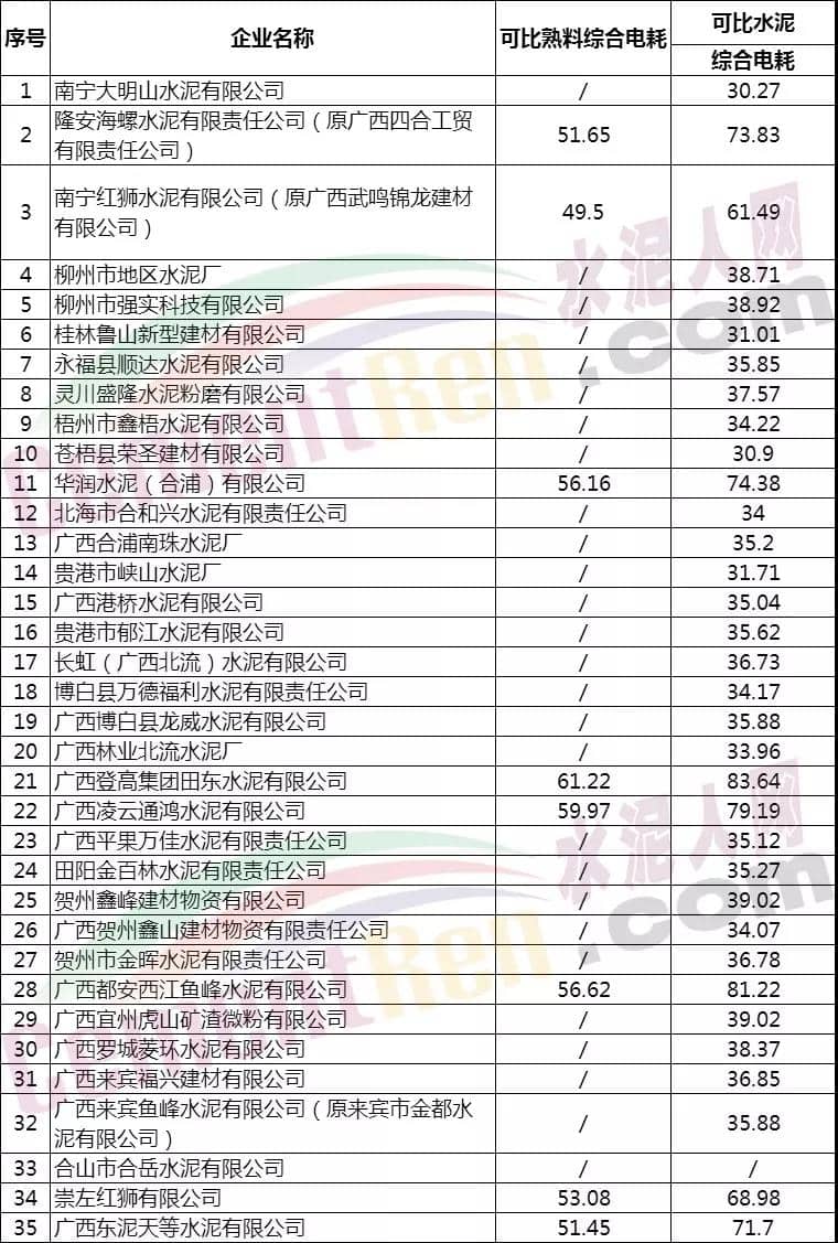 水泥人網(wǎng)消息:日前,廣西壯族自治區(qū)發(fā)改委發(fā)布《廣西壯族自治區(qū)發(fā)展和改革委員會關(guān)于我區(qū)電解鋁水泥鋼鐵企業(yè)執(zhí)行階梯電價(jià)差別電價(jià)有關(guān)事項(xiàng)的通知》稱: 2018年全區(qū)列入監(jiān)察任務(wù)的水泥企業(yè)35家,其中完整水泥生產(chǎn)線企業(yè)8家,水泥粉磨站企業(yè)27家。2018年35家水泥企業(yè)可比熟料綜合電耗、可比水泥綜合電耗等指標(biāo)均達(dá)到《水泥單位產(chǎn)品能源消耗限額》(GB 16780-2012)要求,水泥行業(yè)無超國家能耗企業(yè),不執(zhí)行階梯電價(jià)政策。