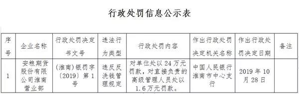 中國(guó)人民銀行合肥中心支行網(wǎng)站近日公布的人民銀行淮南市中心支行轄內(nèi)行政處罰信息公示表((淮南)銀罰字〔2019〕第1號(hào))顯示,安糧期貨股份有限公司淮南營(yíng)業(yè)部(以下簡(jiǎn)稱(chēng):“安糧期貨淮南營(yíng)業(yè)部”)違反反洗錢(qián)管理規(guī)定,中國(guó)人民銀行淮南市中心支行依法作出對(duì)其處以24萬(wàn)元罰款,對(duì)直接負(fù)責(zé)的高級(jí)管理人員處以1.6萬(wàn)元罰款的決定。