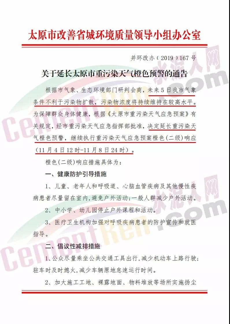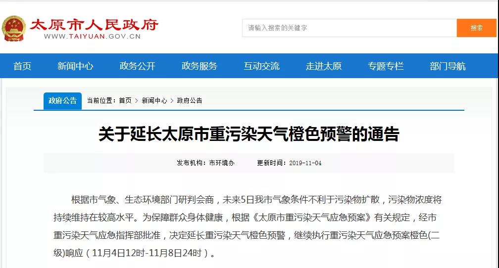 水泥人網(wǎng)消息:日前,太原市人民政府發(fā)布了《關(guān)于延長太原市重污染天氣橙色預(yù)警的通告》稱:根據(jù)太原市氣象、生態(tài)環(huán)境環(huán)境部門研判會商,未來5日太原市氣象條件不利于污染物擴(kuò)散,污染物濃度將持續(xù)維持在較高水平,為保障群眾身體健康,根據(jù)《太原市重污染天氣應(yīng)急預(yù)案》有關(guān)規(guī)定,經(jīng)太原市重污染天氣應(yīng)急指揮部批準(zhǔn),決定延長重污染天氣預(yù)警,繼續(xù)執(zhí)行重污染天氣應(yīng)急預(yù)案橙色二級響應(yīng)(11月4日12時-11月8日24時)。通告原文如下: