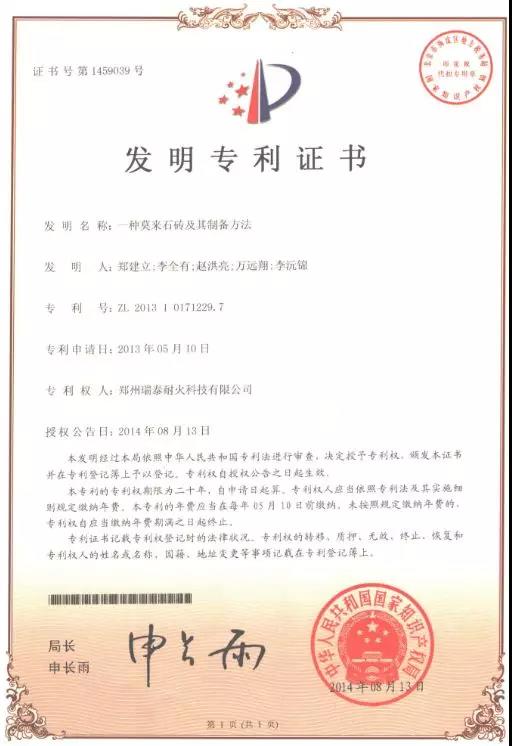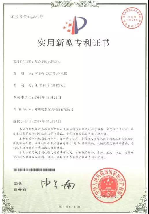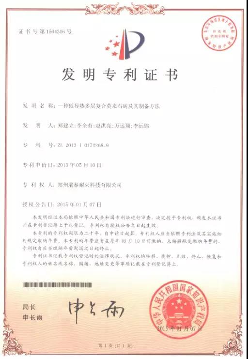 得益于鄭州瑞泰前期縝密的市場(chǎng)調(diào)研和高瞻遠(yuǎn)矚的戰(zhàn)略布局,早在10年前,低導(dǎo)熱多層復(fù)合莫來(lái)石磚就開始了研究,通過3年的研究及小批量試驗(yàn),終于在2012年中旬開始批量推廣應(yīng)用,2013年申請(qǐng)獲得了3項(xiàng)發(fā)明專利,1項(xiàng)實(shí)用新型專利及2項(xiàng)外觀專利,是國(guó)內(nèi)乃至世界上耐火材料行業(yè)首先攻克多層材料膨脹系數(shù)不一致導(dǎo)致結(jié)合部位開裂難題的廠家,同時(shí)也是多層復(fù)合節(jié)能型產(chǎn)品量產(chǎn)推廣第一家?! ?015年7月底鄭州瑞泰研制的低導(dǎo)熱多層復(fù)合莫來(lái)石磚通過了河南省科技廳組織的科技成果鑒定,參與鑒定專家一致給予該產(chǎn)品較高的評(píng)價(jià),認(rèn)為其綜合技術(shù)水平達(dá)到了國(guó)際領(lǐng)先水平。次年該產(chǎn)品更是獲得了河南省科技進(jìn)步獎(jiǎng)三等獎(jiǎng)、鄭州市科技進(jìn)步獎(jiǎng)一等獎(jiǎng)、中國(guó)建材聯(lián)合會(huì)科技進(jìn)步獎(jiǎng)二等獎(jiǎng),這些獎(jiǎng)項(xiàng)的獲得給鄭州瑞泰帶來(lái)的不僅僅是榮譽(yù),更是對(duì)該節(jié)能型產(chǎn)品的認(rèn)可?! 〗?jīng)過7年多國(guó)內(nèi)外數(shù)百家水泥企業(yè)客戶使用印證,鄭州瑞泰研究的這種低導(dǎo)熱多層復(fù)合莫來(lái)石磚使用安全可靠,沒有一例使用過程中從結(jié)合部位開裂的案例,并且隔熱效果明顯,客戶使用后同比條件下均能比硅莫磚降低50~80℃,噸水泥煤耗可降1.5~2Kg。很多客戶使用至后期時(shí)發(fā)現(xiàn)該節(jié)能產(chǎn)品比相鄰硅莫磚溫度低了60~90℃,相同部位使用壽命平均比硅莫磚高2~3個(gè)月,再次證明該節(jié)能型產(chǎn)品的隔熱效果為使用全周期,隔熱效果并未因使用時(shí)間變長(zhǎng)而變差。 鄭州瑞泰近些年通過大量客戶使用數(shù)據(jù)反饋,不斷優(yōu)化產(chǎn)品配比及結(jié)構(gòu)性能,為客戶帶了使用更加安全,節(jié)能效果更佳顯著,品種更加豐富的節(jié)能型產(chǎn)品。在低導(dǎo)熱多層復(fù)合莫來(lái)石磚國(guó)家行業(yè)標(biāo)準(zhǔn)發(fā)布前期,鄭州瑞泰更是憑借該產(chǎn)品獲得中國(guó)建材集團(tuán)“壯麗70年,世界之最”十四項(xiàng)重大項(xiàng)目之一。 這些榮譽(yù)的獲得激勵(lì)著鄭州瑞泰人朝著“綠色發(fā)展、行業(yè)引領(lǐng)”不斷前行。