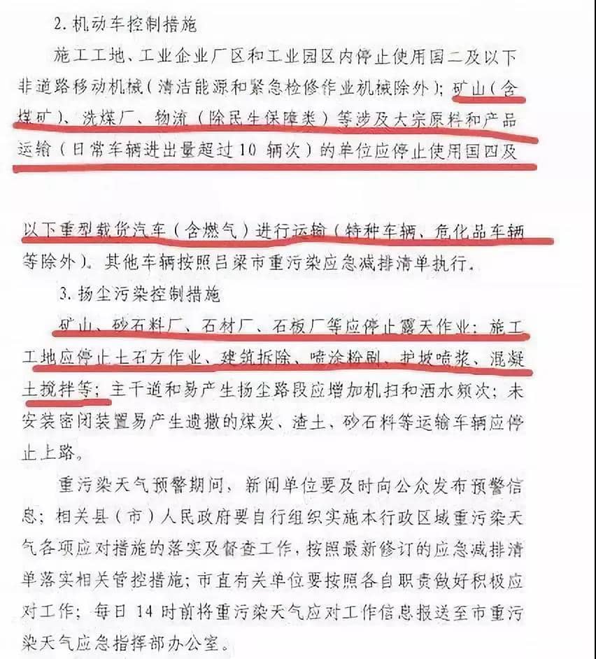 移動(dòng)源減排措施:施工工地、工業(yè)企業(yè)廠(chǎng)區(qū)及工業(yè)園內(nèi)停止使用國(guó)二及以下非道路移動(dòng)機(jī)械(清潔能源和緊急搶修作業(yè)機(jī)械除外);礦山(含煤礦)、洗煤廠(chǎng)、物流(除民生保障類(lèi))等涉及大宗物料運(yùn)輸(日常車(chē)輛進(jìn)出超過(guò)10輛次)的單位停止使用國(guó)四及以下重型載貨車(chē)(含燃?xì)?進(jìn)行運(yùn)輸(特種車(chē)輛、?;奋?chē)輛等除外);鋼鐵、焦化、有色、電力、化工、煤炭、玻璃等重點(diǎn)行業(yè)涉及大宗物料運(yùn)輸?shù)钠髽I(yè)按照“工業(yè)源減排清單”中橙色預(yù)警車(chē)輛運(yùn)輸減排要求執(zhí)行;在高速環(huán)內(nèi)實(shí)行交通管控,除運(yùn)輸瓜果蔬菜等新鮮農(nóng)產(chǎn)品車(chē)輛及清障、環(huán)衛(wèi)、園林、道路養(yǎng)護(hù)等專(zhuān)項(xiàng)作業(yè)車(chē)輛外,禁止中重型載貨車(chē)通行。