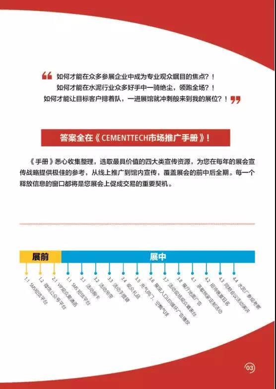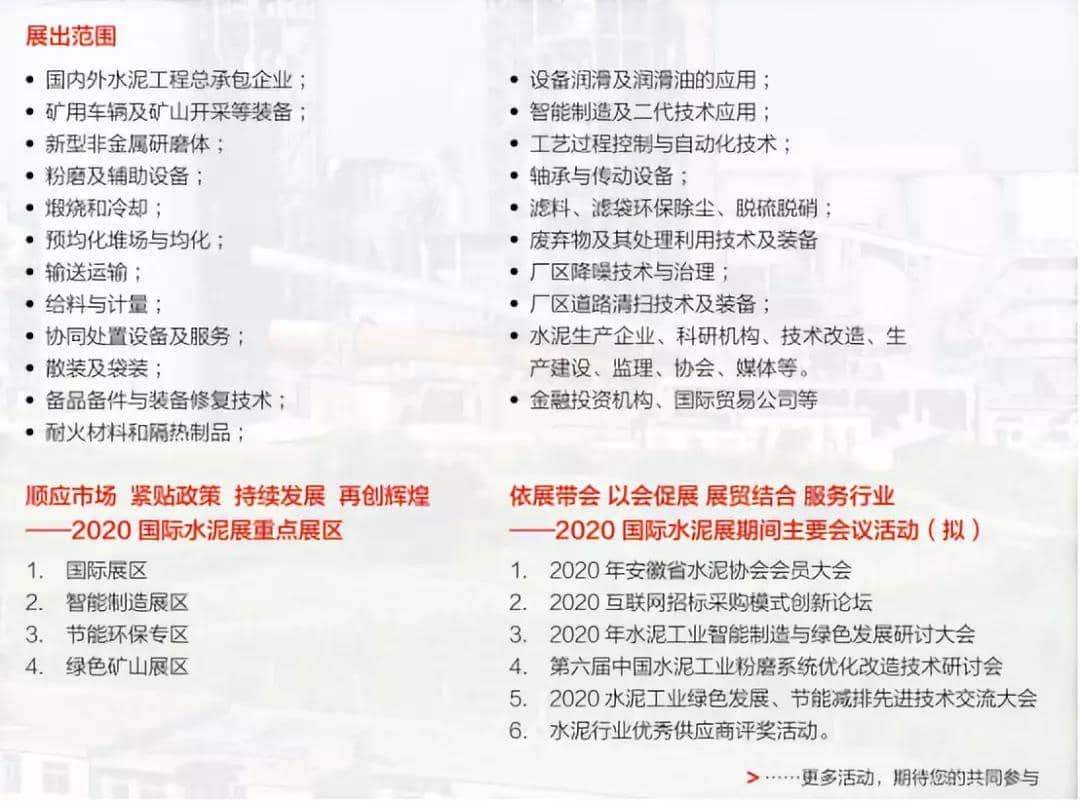 中國國際水泥技術(shù)及裝備展作為行業(yè)內(nèi)影響力最大的專業(yè)展,展出面積超過20000平方米,為國際水泥相關(guān)設備制造商和服務供應商提供客戶開發(fā)、渠道拓展和品牌宣傳維護等專業(yè)服務;憑借十余年的專業(yè)經(jīng)驗,水泥展已成為行業(yè)內(nèi)最具影響力和號召力的服務貿(mào)易平臺!