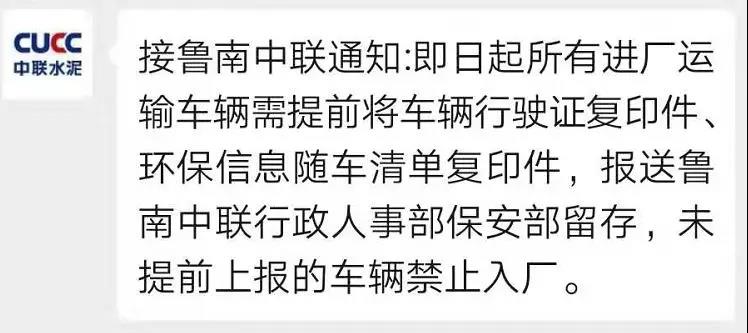 魯南中聯(lián)水泥通知所有進(jìn)廠運(yùn)輸車輛需提前將車輛行駛證復(fù)印件,環(huán)保信息隨車清單復(fù)印件,報(bào)送行政人事部保安部留存,未提前上報(bào)的車輛禁止入廠。據(jù)水泥人網(wǎng)了解,山東絕大多數(shù)企業(yè)自上月下旬開始執(zhí)行限量供應(yīng)以保供重點(diǎn)項(xiàng)目。日前,水泥人網(wǎng)轉(zhuǎn)發(fā)了《山東水泥行業(yè)2019-2020年度秋冬季錯(cuò)峰生產(chǎn)實(shí)施方案》(相關(guān)鏈接:定了!山東省所有水泥企業(yè)11月15日停產(chǎn)4個(gè)月!),消息一經(jīng)發(fā)出山東周邊河北、河南等多區(qū)域都沸騰了。截止目前泛東北區(qū)域遼寧、黑龍江、內(nèi)蒙古以及山東、山西等多區(qū)域已經(jīng)提前發(fā)布了采暖季錯(cuò)峰生產(chǎn)計(jì)劃。河南省也早在2月下旬發(fā)布的大氣污染防治攻堅(jiān)實(shí)施方案中就提到了11月、12月份停窯。