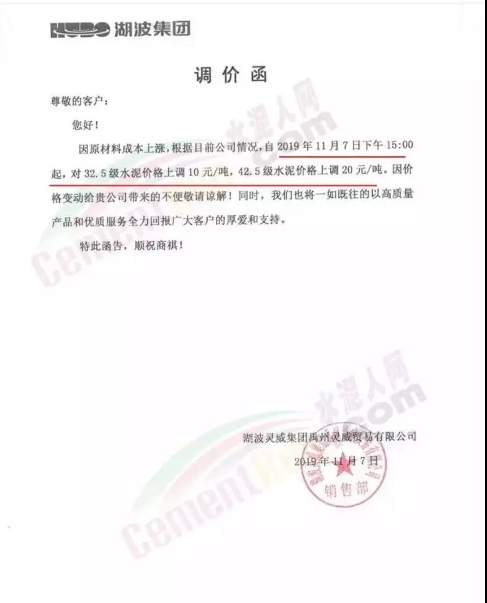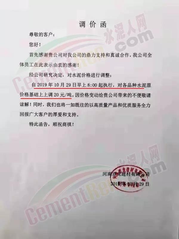 根據(jù)目前市場(chǎng)形勢(shì)及公司生產(chǎn)情況,我司決定于2019年11月9日00:00起,對(duì)廣西全區(qū)域各品種袋裝價(jià)格上調(diào)20元/噸、散裝價(jià)格上調(diào)30元/噸、熟料價(jià)格上調(diào)20元/噸。