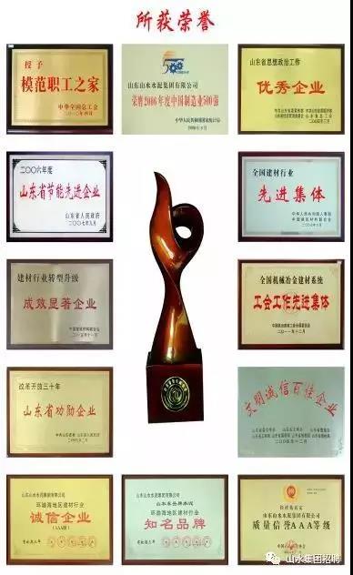 多年來,山水集團先后被授予全國建材系統(tǒng)先進集體、全國五一勞動獎狀、全國先進基層黨組織、全國模范職工之家、山東省文明單位、山東省納稅百強企業(yè)、香港上市公司100強、中國500強、中國建材行業(yè)20強等榮譽稱號。