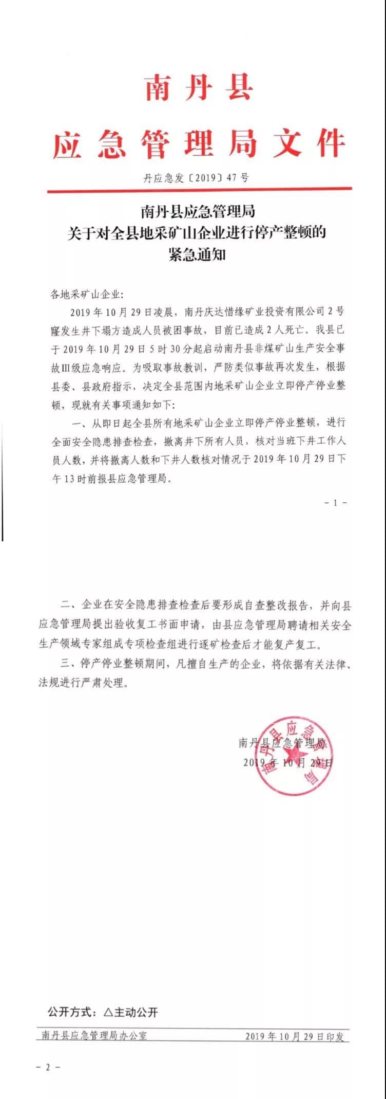 南丹一礦業(yè)公司發(fā)生冒頂事故 目前事故造成2人死亡記者從廣西南丹縣應(yīng)急管理局了解到,2019年10月29日凌晨3時20分,廣西南丹縣大坪村礦區(qū)鋅銀鉛銻錫銅礦礦區(qū)的南丹縣慶達(dá)惜緣礦業(yè)投資有限公司發(fā)生冒頂事故?! 〗拥饺罕妶蟀负?,河池市、南丹縣立即啟動應(yīng)急預(yù)案,市縣兩級領(lǐng)導(dǎo)和應(yīng)急、衛(wèi)健、自然資源、公安、消防、武警等部門,以及專業(yè)救援隊第一時間趕赴現(xiàn)場全力實施搜救。經(jīng)全力救援,已發(fā)現(xiàn)2人,均無生命體征。其他被困人員正在搜救中,事故具體情況正在進(jìn)一步核實中。(央視記者 宋大珩)