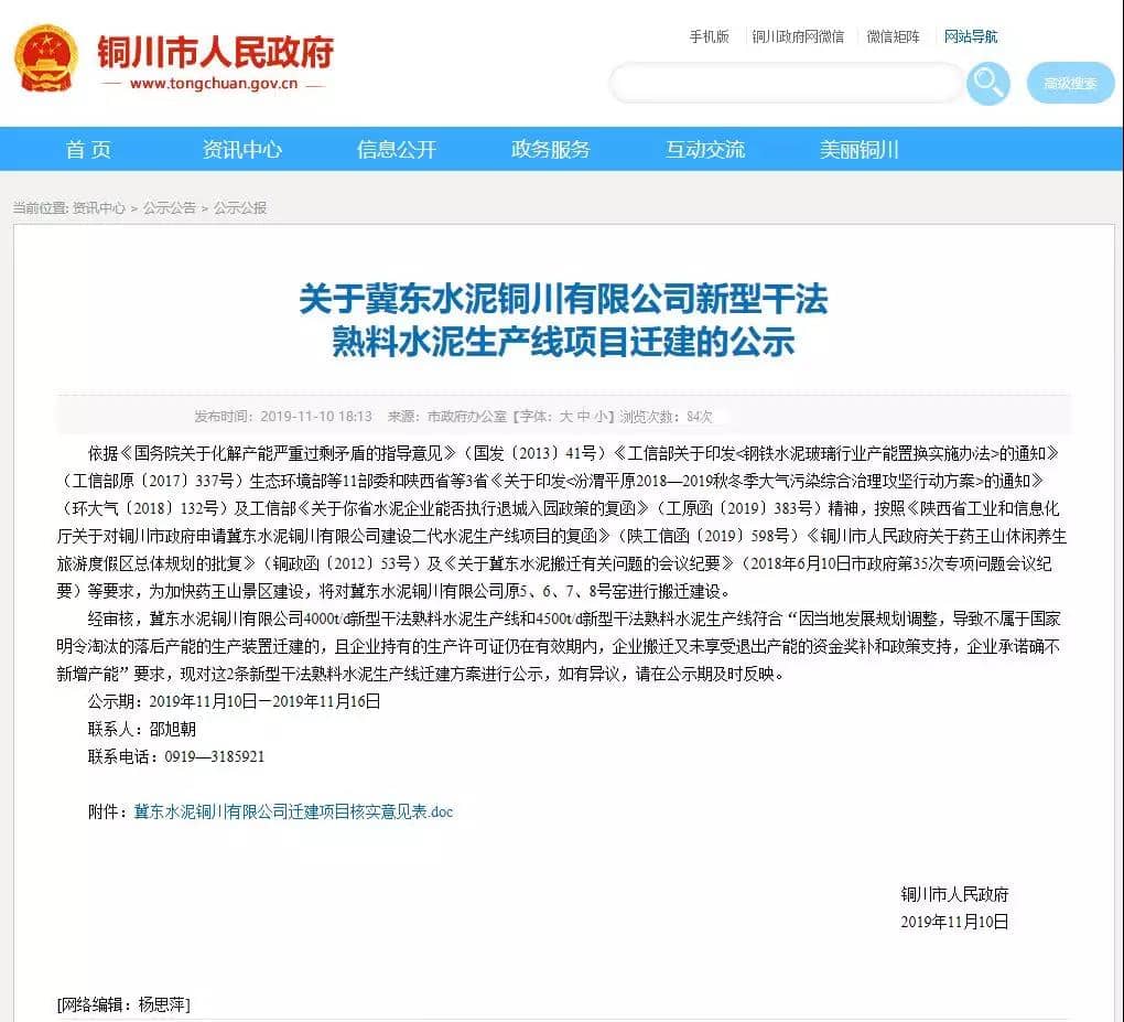 水泥人網(wǎng)消息:昨日(11月10日),陜西省銅川市人民政府發(fā)布《關(guān)于冀東水泥銅川有限公司新型干法熟料水泥生產(chǎn)線項目遷建的公示》稱為加快藥王山景區(qū)建設(shè),將對冀東水泥銅川有限公司原5、6、7、8號窯進行搬遷建設(shè)。