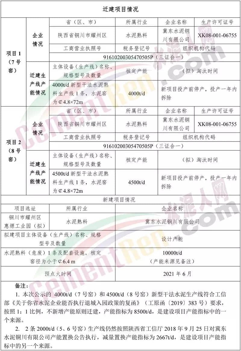 經(jīng)審核,冀東水泥銅川有限公司4000t/d新型干法熟料水泥生產(chǎn)線和4500t/d新型干法熟料水泥生產(chǎn)線符合“因當(dāng)?shù)匕l(fā)展規(guī)劃調(diào)整,導(dǎo)致不屬于國家明令淘汰的落后產(chǎn)能的生產(chǎn)裝置遷建的,且企業(yè)持有的生產(chǎn)許可證仍在有效期內(nèi),企業(yè)搬遷又未享受退出產(chǎn)能的資金獎補和政策支持,企業(yè)承諾確不新增產(chǎn)能”要求。公示原文如下: