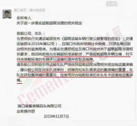 11月7日,海口港集裝箱碼頭有限公司業(yè)務(wù)操作部發(fā)布《關(guān)于進(jìn)一步落實(shí)超載超限治理的相關(guān)規(guī)定》通知稱,公司將拒絕為車輛超標(biāo)準(zhǔn)裝配貨,嚴(yán)禁超載超限車輛出港,對不符合裝載標(biāo)準(zhǔn)的車輛予以退箱處理并收取退箱費(fèi)。同時(shí),建議船公司向車隊(duì)派單時(shí),明確告知車隊(duì)需承運(yùn)的集裝箱的重要,車隊(duì)在獲知集裝箱的重后,應(yīng)使用符合軸數(shù)標(biāo)準(zhǔn)的車頭車卡進(jìn)港拖運(yùn)集裝箱。