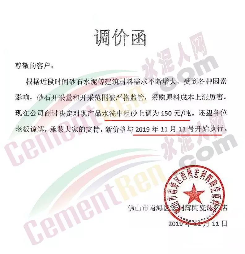 日前,廣東省佛山市南海區(qū)宏利輝陶瓷原料店發(fā)布調(diào)價(jià)函稱,根據(jù)近段時(shí)間砂石水泥等建材需求不斷增大,受各種因素影響,砂石開采量和開采范圍被嚴(yán)格監(jiān)管,采購原料成本上漲厲害。公司商討決定對產(chǎn)品水洗中粗砂上調(diào)為150元/噸。新價(jià)格與11月11日開始執(zhí)行。