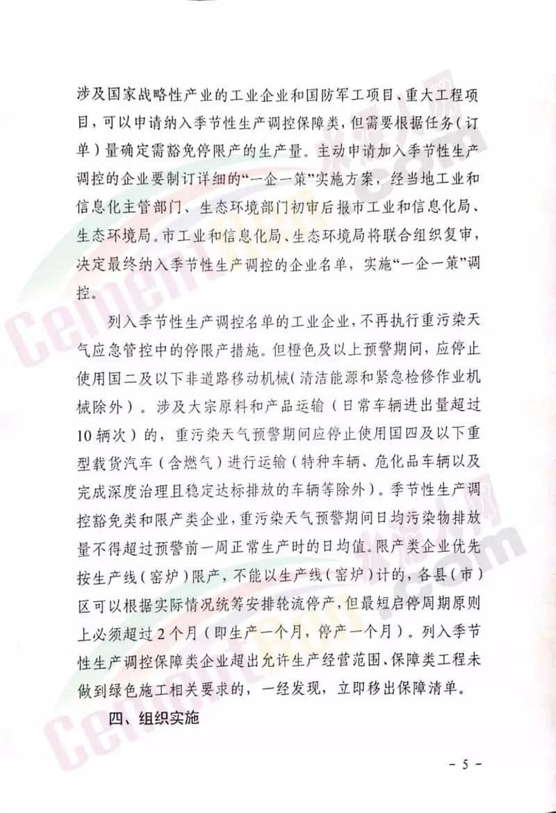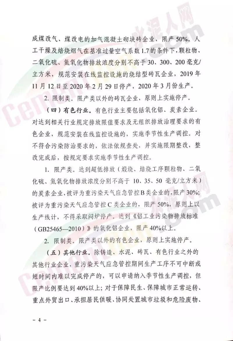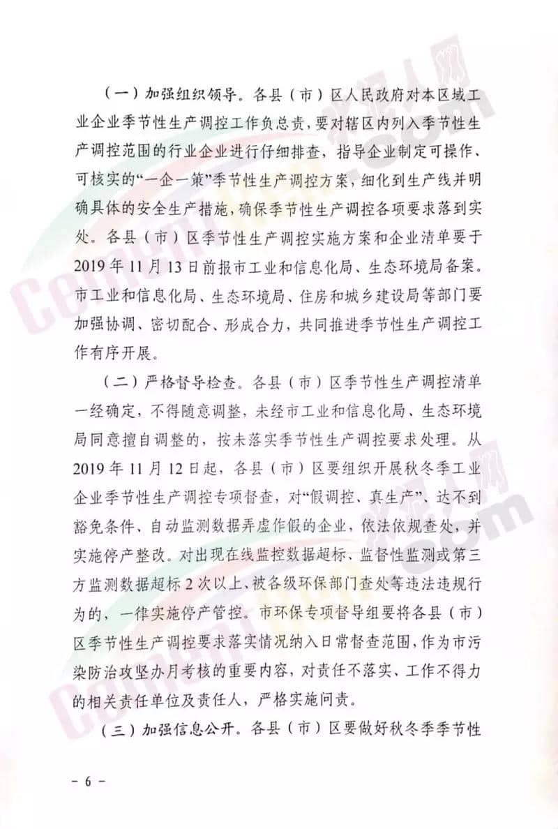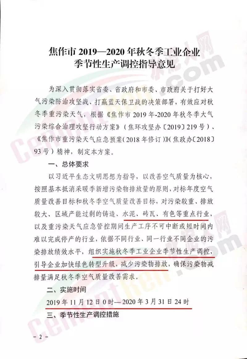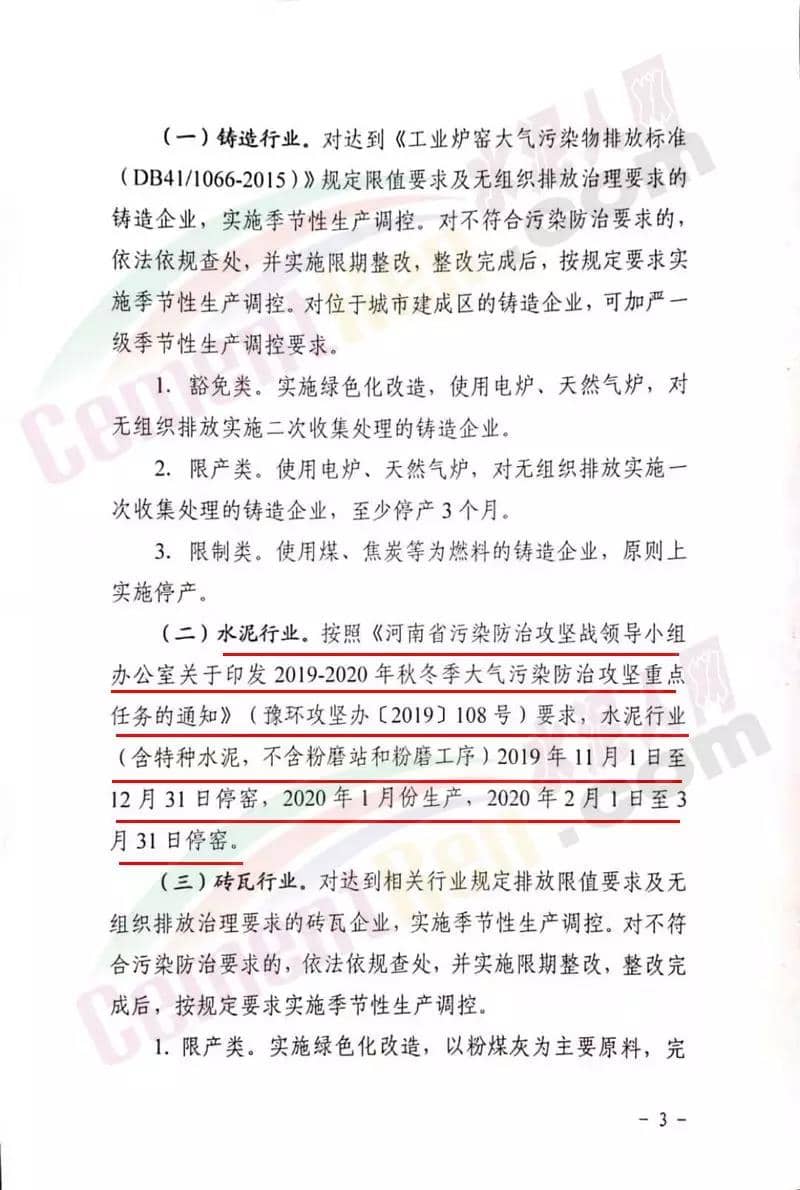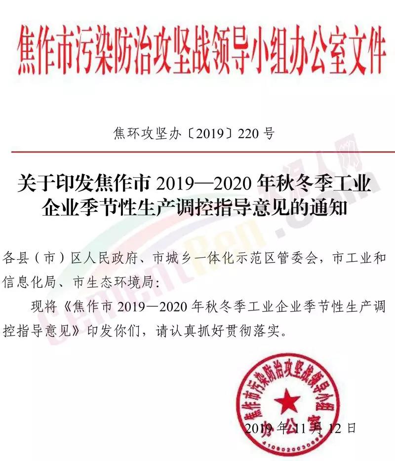 日前,焦作市污染物防治攻堅(jiān)戰(zhàn)領(lǐng)導(dǎo)小組辦公室發(fā)布《關(guān)于印發(fā)焦作市 2019—2020 年秋冬季工業(yè)企業(yè)季節(jié)性生產(chǎn)調(diào)控指導(dǎo)意見的通知》。其中《焦作市 2019—2020 年秋冬季工業(yè)企業(yè)季節(jié)性生產(chǎn)調(diào)控指導(dǎo)意見的通知》要求水泥、磚瓦、有色等重點(diǎn)行業(yè),以據(jù)不同行業(yè),同一行業(yè)不同企業(yè)的污染排放績效水平,組織實(shí)施秋冬季工業(yè)企業(yè)季節(jié)性生產(chǎn) 調(diào)控,引導(dǎo)企業(yè)加快綠色轉(zhuǎn)變型升級(jí),減少污染物排放,確保污染物減排量滿足秋冬季空氣質(zhì)量改善需求。實(shí)施時(shí)間:2019年11月12日0時(shí)至2020年3月31日24時(shí)季節(jié)性生產(chǎn)調(diào)控措施要求水泥行業(yè),按照《河南省污染防治攻堅(jiān)戰(zhàn)領(lǐng)導(dǎo)小組辦公室關(guān)于印發(fā)2019-2020年秋冬季大氣污染防治攻堅(jiān)重點(diǎn)任務(wù)的通知》要求,水泥行業(yè)(含特種水泥、不含粉磨站和粉磨工序)2019年11月1日至12月31日停窯,2020年1月份生產(chǎn),2020年2月1日至3月31日停窯。對于保障民生、保障城市 正常運(yùn)轉(zhuǎn)、重點(diǎn)外貿(mào)出口、承擔(dān)居民供暖、協(xié)同處置城市垃圾和危險(xiǎn)廢物等項(xiàng)目可以申請納入季節(jié)性生產(chǎn)調(diào)控保障類,但需要根據(jù)任務(wù)量確定需豁免停限產(chǎn)的生產(chǎn)量。通知原文如下: