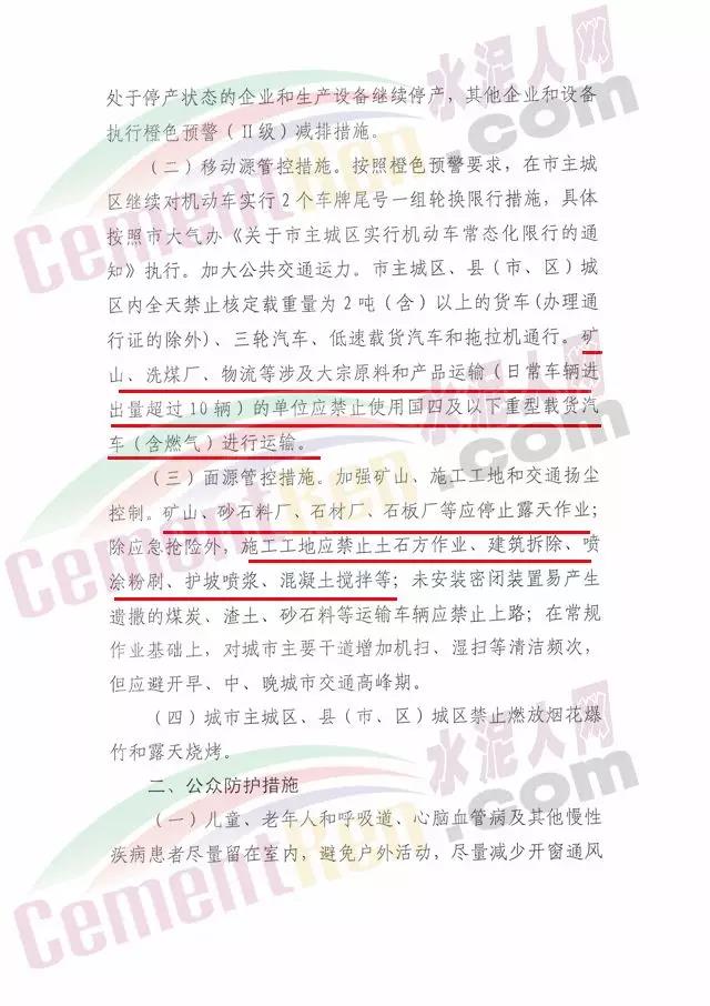 揚(yáng)塵源減排措施。礦山、砂石料廠、石材廠、石板廠等停止露天作業(yè);施工工地停止土石方作業(yè)(包括停止建筑拆除、土石方開挖、回填、場(chǎng)內(nèi)倒運(yùn)、摻拌石灰、混凝土剔鑿等作業(yè),停止建筑工程配套道路和管溝開挖作業(yè));建筑垃圾清運(yùn)車輛和砂石運(yùn)輸車輛禁止上路行駛,開挖土石方的挖掘機(jī)等非道路移動(dòng)機(jī)械停止作業(yè)。