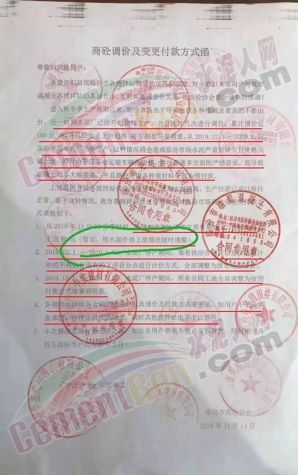 日前,山西臨汾市商砼協(xié)會(huì)發(fā)函稱,近一時(shí)期水泥廠已經(jīng)開始錯(cuò)峰生產(chǎn),并且根據(jù)環(huán)保需求從12月1日至2020年1月有31日臨汾市水泥廠全部停產(chǎn),這種情況將會(huì)造成臨汾市場水泥嚴(yán)重短缺并且價(jià)格大幅上漲,同時(shí)對(duì)運(yùn)輸車輛超限加大力度治理再疊加銀行等諸多方面的嚴(yán)格要求,都導(dǎo)致混凝土成本大幅提高,并且商砼所用各種原材料全部為預(yù)付款。