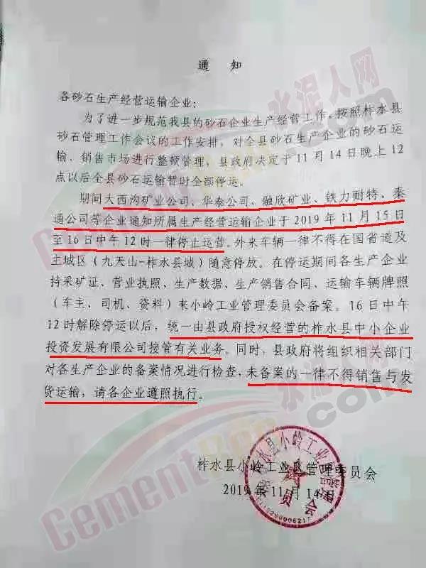 陜西省商洛市柞水縣小嶺工業(yè)區(qū)管理委員會(huì)發(fā)通知給砂石生產(chǎn)經(jīng)營運(yùn)輸企業(yè)稱,為進(jìn)一步規(guī)定縣域境內(nèi)的砂石企業(yè)生產(chǎn)經(jīng)營工作。按照縣砂石管理工作會(huì)議的工作安排 ,對(duì)全縣砂石生產(chǎn)企業(yè)的砂石運(yùn)輸,銷售市場進(jìn)行整頓管理??h政府決定于11月14日晚上12時(shí)以后全縣砂石運(yùn)輸暫時(shí)全部停運(yùn)。