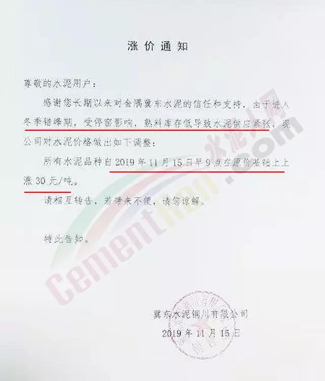 不僅砂石,昨日陜西關(guān)中地區(qū)冀東,聲威,堯柏等多家主導(dǎo)企業(yè)通知上調(diào)水泥價(jià)格。銅川冀東水泥漲價(jià)通知稱,由于進(jìn)入冬季錯(cuò)峰期,受停窯影響,熟料庫存低導(dǎo)致水泥供應(yīng)緊張。所有水泥品種自11月15日早9點(diǎn)在原價(jià)基礎(chǔ)上上調(diào)30元/噸。