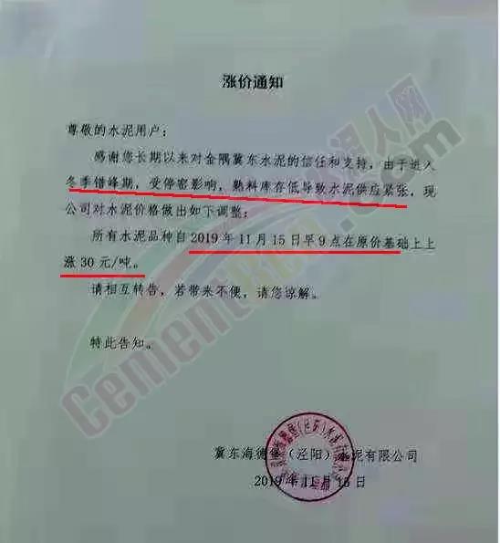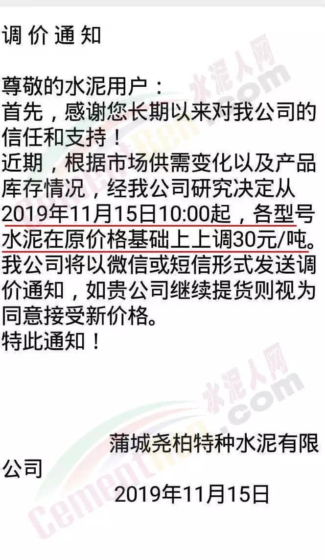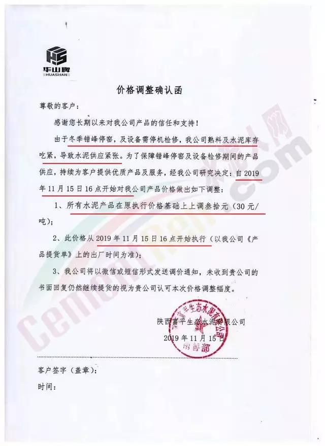 陜西富平生態(tài)水泥有限公司價(jià)格調(diào)整確認(rèn)函稱,由于冬季錯(cuò)峰停窯及設(shè)備需停機(jī)檢修,公司熟料及水泥庫存吃緊,導(dǎo)致水泥供應(yīng)緊張。為保障錯(cuò)峰停窯及設(shè)備檢修期間的產(chǎn)品供應(yīng),經(jīng)公司研究決定自11月15日16時(shí)起對(duì)公司產(chǎn)品價(jià)格上調(diào)30元/噸。