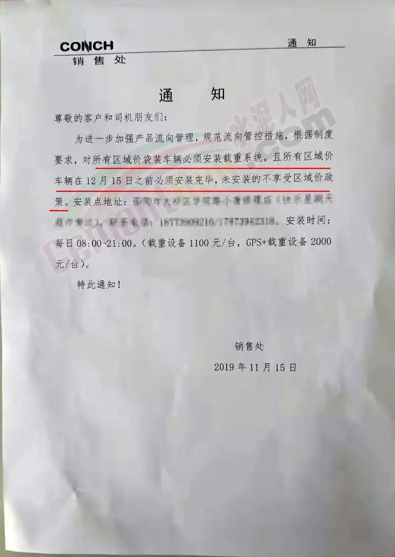 日前,海螺水泥湖南紹陽公司通知為進(jìn)一步強(qiáng)強(qiáng)產(chǎn)品流向管理,規(guī)范流向管控措施,根據(jù)制度要求,對(duì)所有區(qū)域價(jià)袋裝車輛必須安裝載重系統(tǒng),且所有區(qū)域價(jià)車輛在下月15日前必須安裝完畢,未安裝的不享受區(qū)域價(jià)政策。其中載重設(shè)備1100元/臺(tái),GPS+載重設(shè)備2000元/臺(tái)。