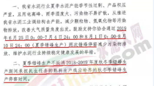 河北省水泥企業(yè)錯(cuò)峰停產(chǎn)天數(shù)為185天,夏季錯(cuò)峰生產(chǎn)時(shí)間2019年6月25日0:00-7月4日24:00時(shí)和8月1日0:00-8月10日24:00時(shí),時(shí)間共18天。